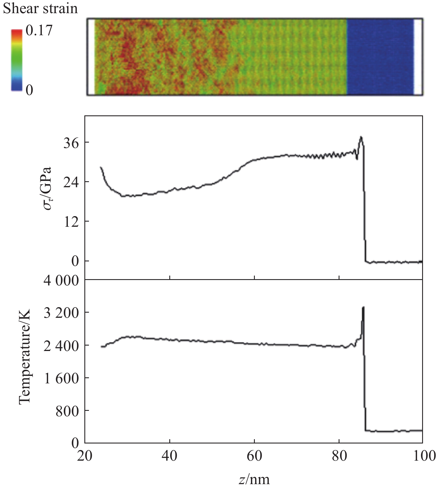 图14给出了t=5.6 ps时试样内部剪切应变的空间分布以及对应的剪应力和温度剖面。可以看到,在试样内部z=30 nm附近形成了明显的剪切应变集中,与之对应的是该处剪切应力较低,而温度较高。这种特征一直延伸至剪切应变逐渐平缓的z=65 nm处。随后,剪切应力增大,温度降低。该结果与文献[25]的结果定性一致,说明剪切应变、剪应力与温度之间存在一定的关联。