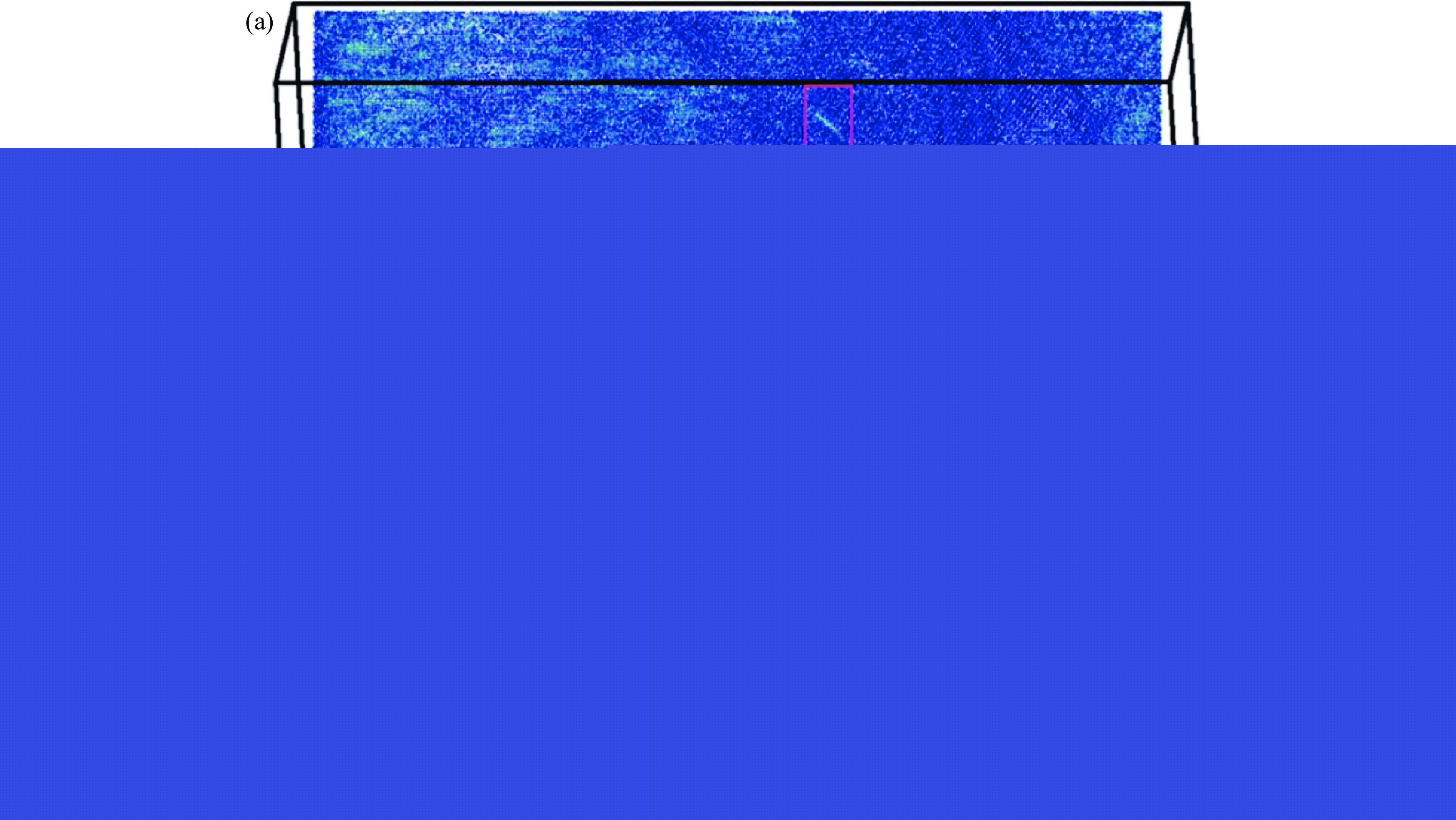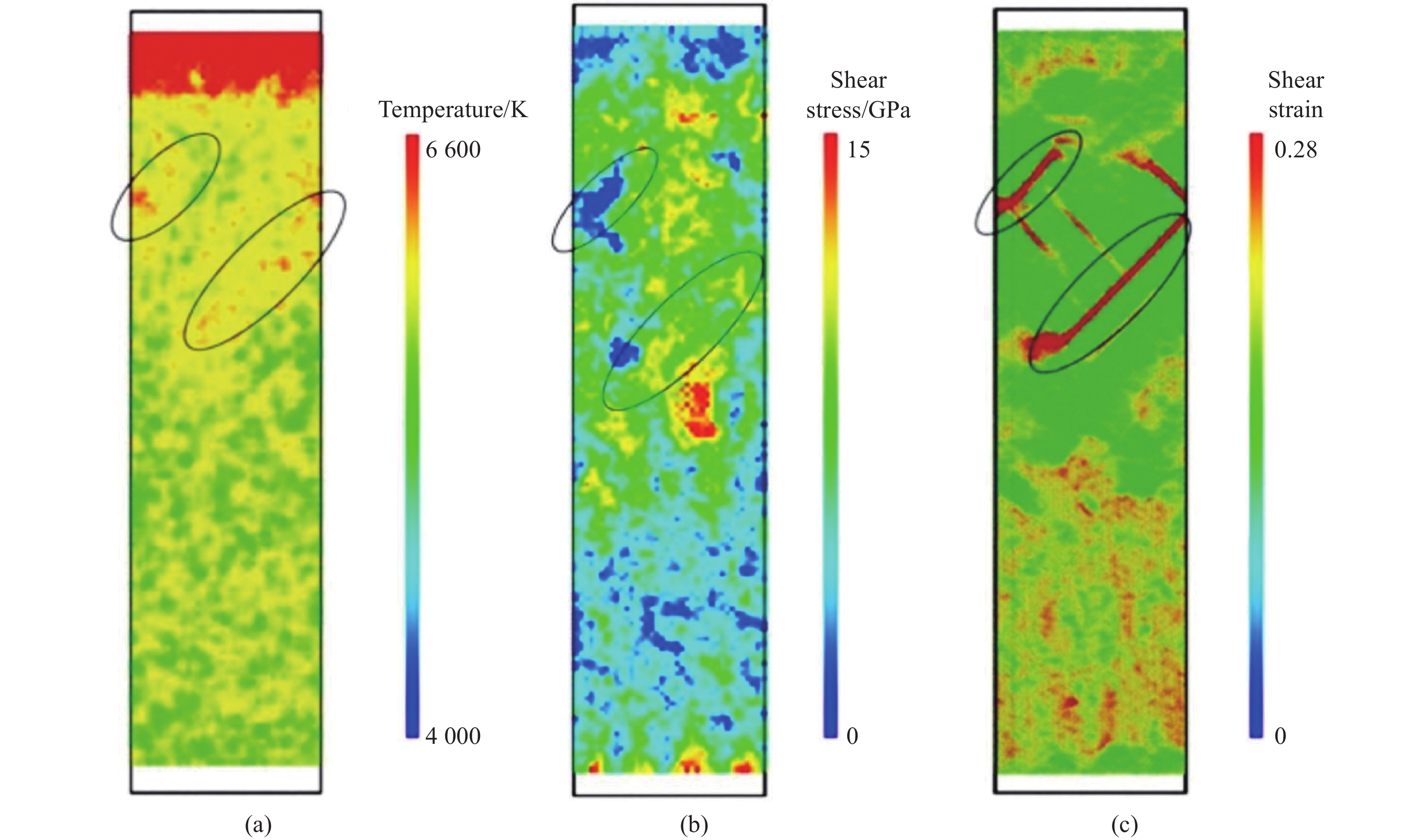 在分子动力学模拟的框架下,局部温度可由分子/原子的脉动速度计算得到,见式(9)。为了得到冲击加载过程中试样内部的温度分布,将试样在xyz三维空间中均分成2.6×105个网格,计算每个网格内原子的平均运动速度,得到每个原子相对于该空间平均速度的脉动速度,而后,基于式(9)计算得到试样内部的温度。图15(a)显示了计算得到的试样内部温度的空间分布。为便于比较,图15(b)和图15(c)给出了对应时刻剪应力和剪切应变的空间分布。可以看到,该时刻试样前端出现了明显的剪切应变集中,形成了滑移带。对比后发现,剪切应变集中区域的剪应力低于周边区域的剪应力,而剪切应变集中区域的温度高于周边区域温度。这一结果说明,局域高温区(热点)的形成区域与剪切局域化区域存在一定的对应关系。