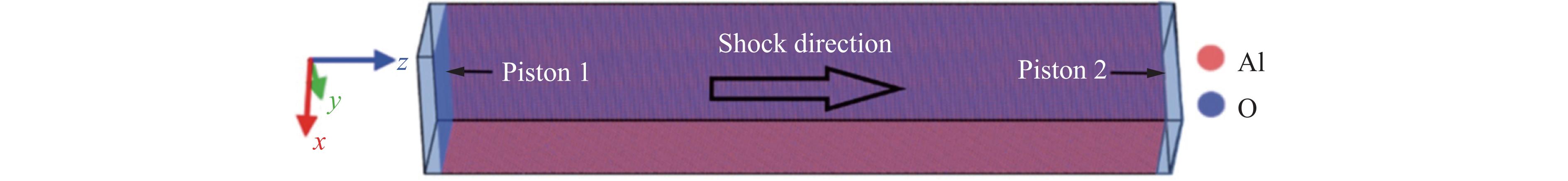 $ {r_0} $ 为粒子间相互作用力最小时对应的距离,$ {\theta _{jik}} $ 为rij与rik的夹角,$ {\bar \theta _{jik}} $ 和Cjik为常量,$ \Theta \left( {{r_0} - {r_{ij}}} \right) $ 为Heavisid阶跃函数。本研究的所有数值模拟都是基于开源分子动力学模拟软件LAMMPS开展的。对于通过扩胞操作获得的蓝宝石试样,首先,基于共轭梯度法对试样进行能量最小化处理,并在模拟中沿x、y、z轴设置周期性边界条件;随后,在NPT系综下,以0.1 fs的时间步长进行总时长为40 ps的结构优化,以确保系统达到完全平衡;在冲击加载前,将z方向(冲击加载方向)的周期性边界条件更改为自由边界条件,随后,在NVE系综条件下,在试样左侧设置一个以恒定速度沿z方向运动的刚体活塞,活塞持续向右侧(沿z轴)冲击蓝宝石试样,如图2所示。本研究考察了6种不同的冲击加载工况,冲击速度在1~6 km/s范围内。