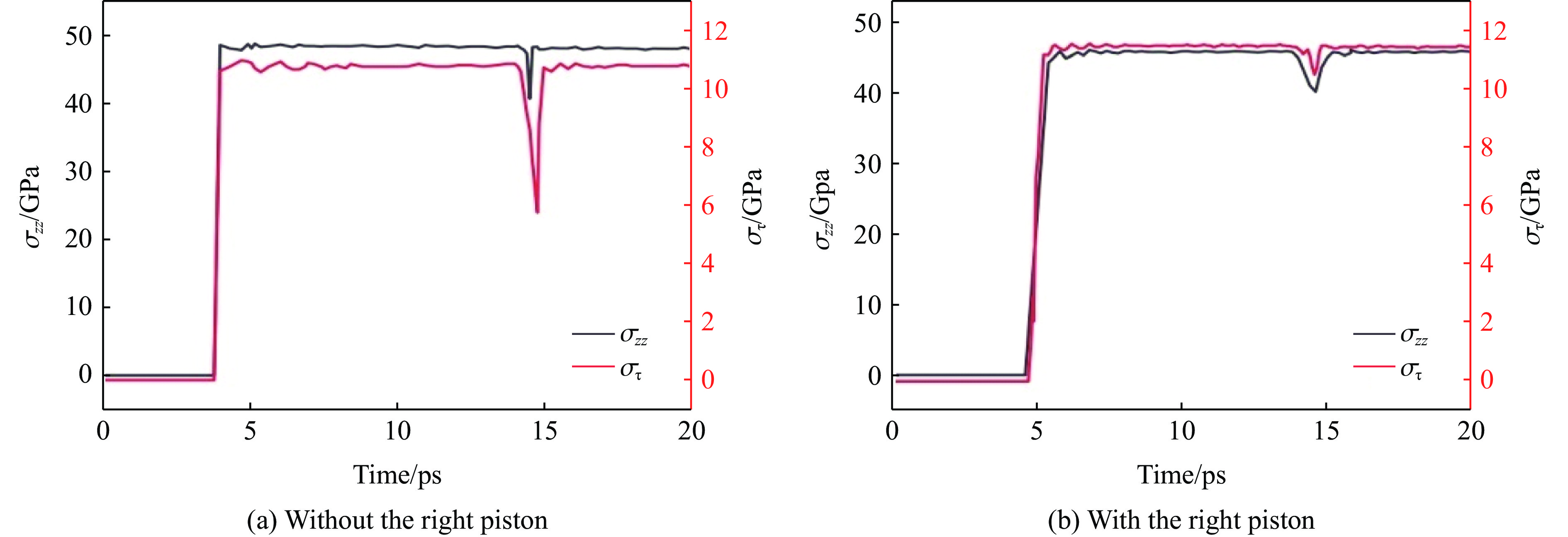 随着加载的进行,当冲击波抵达试样右侧面,形成一个向后传播的稀疏波。在二维数值模拟中,学者们一般采用增加试样长度的方式来避免后界面稀疏波的影响[18]。受分子动力学三维数值模拟计算量的限制,本研究很难进一步增加试样的长度。为了弱化稀疏波的影响,借鉴Yu等[19–20]在研究透明陶瓷冲击力学响应特性中的格点弹簧模型的模拟策略,在试样右侧也设置一个刚体活塞。当冲击波阵面传播至试样右侧面时,右侧活塞以与试样右侧自由表面相同的速度运动,进而削弱向后传播稀疏波的强度。图3对比了无、有右侧活塞情况下试样内部的应力状态。当试样右侧无刚体活塞时,稀疏波在试样内反向传播过程中形成一个明显的低压区,如图3(a)所示;当试样右侧存在一个紧贴自由面的刚体活塞时,尽管不能完全消除反向传播的稀疏波,但能明显降低稀疏波的强度,这是因为试样内部稀疏波传播导致的正应力和剪切应力的下降幅度显著降低,如图3(b)所示。