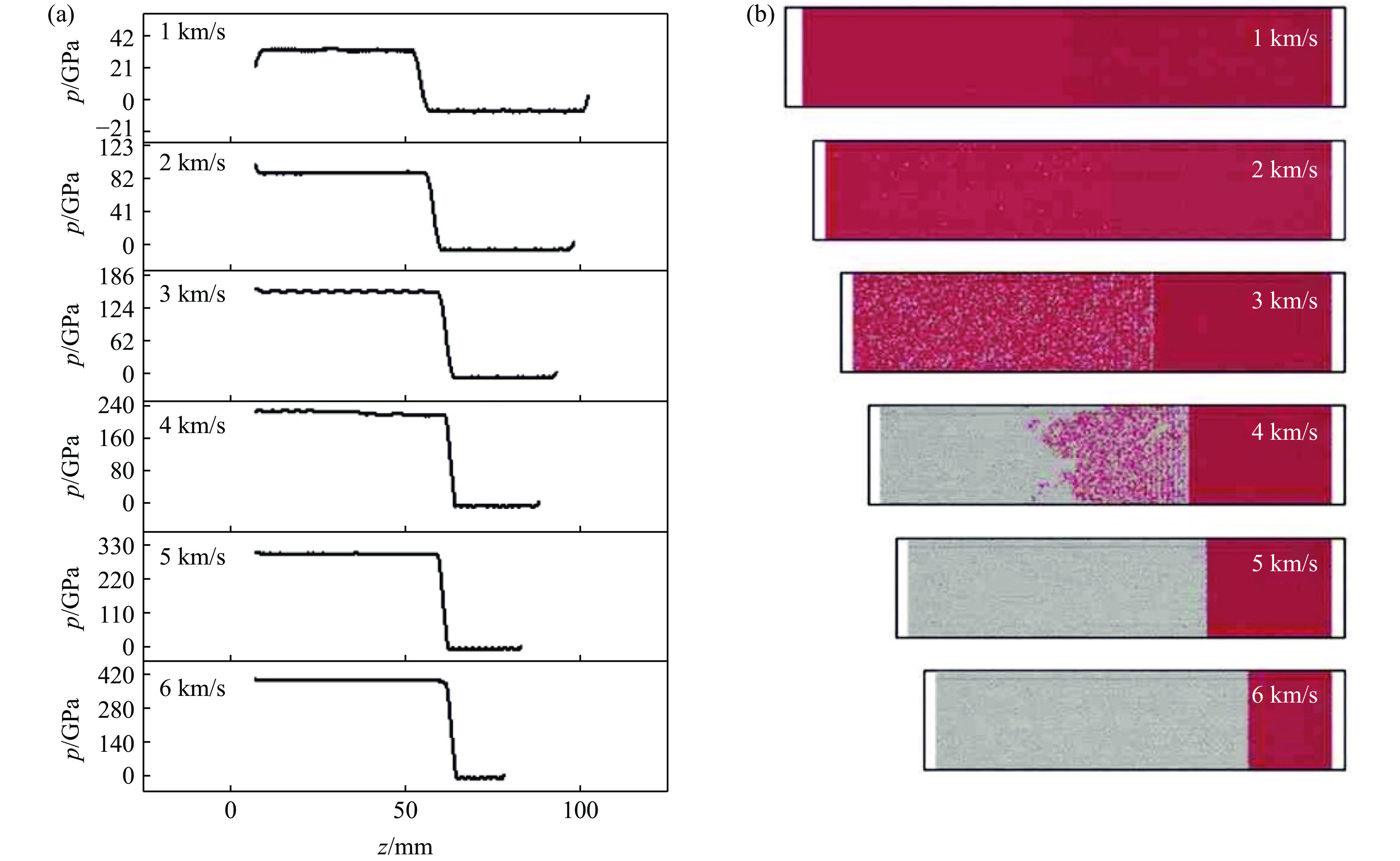 图4给出了冲击加载5.0 ps后试样内部的压强剖面以及沿z轴(冲击加载方向)氧原子排列方式的变化。图4(a)表明,在所考察的6个加载速度条件下,冲击速度对压强剖面的线形影响不大,波阵面都十分陡峭。图4(b)中,红色为密排六方结构的氧原子,灰色为其他结构的氧原子。由图4(b)可以看到:在1 km/s冲击速度条件下,原子排列方式未发生破坏,氧原子间仍保持密排六方结构;随着冲击速度的增大(2、3 km/s时),波阵面后方部分氧原子的密排六方结构被破坏;当冲击速度增大至4 km/s时,波阵面后方氧原子排列结构呈现出2种状态,即在冲击波前端区域,部分氧原子仍保持密排六方结构,在冲击波后端区域,氧原子密排六方结构被完全破坏;当冲击速度达到5 km/s时,波阵面后氧原子的密排六方结构被完全破坏。
