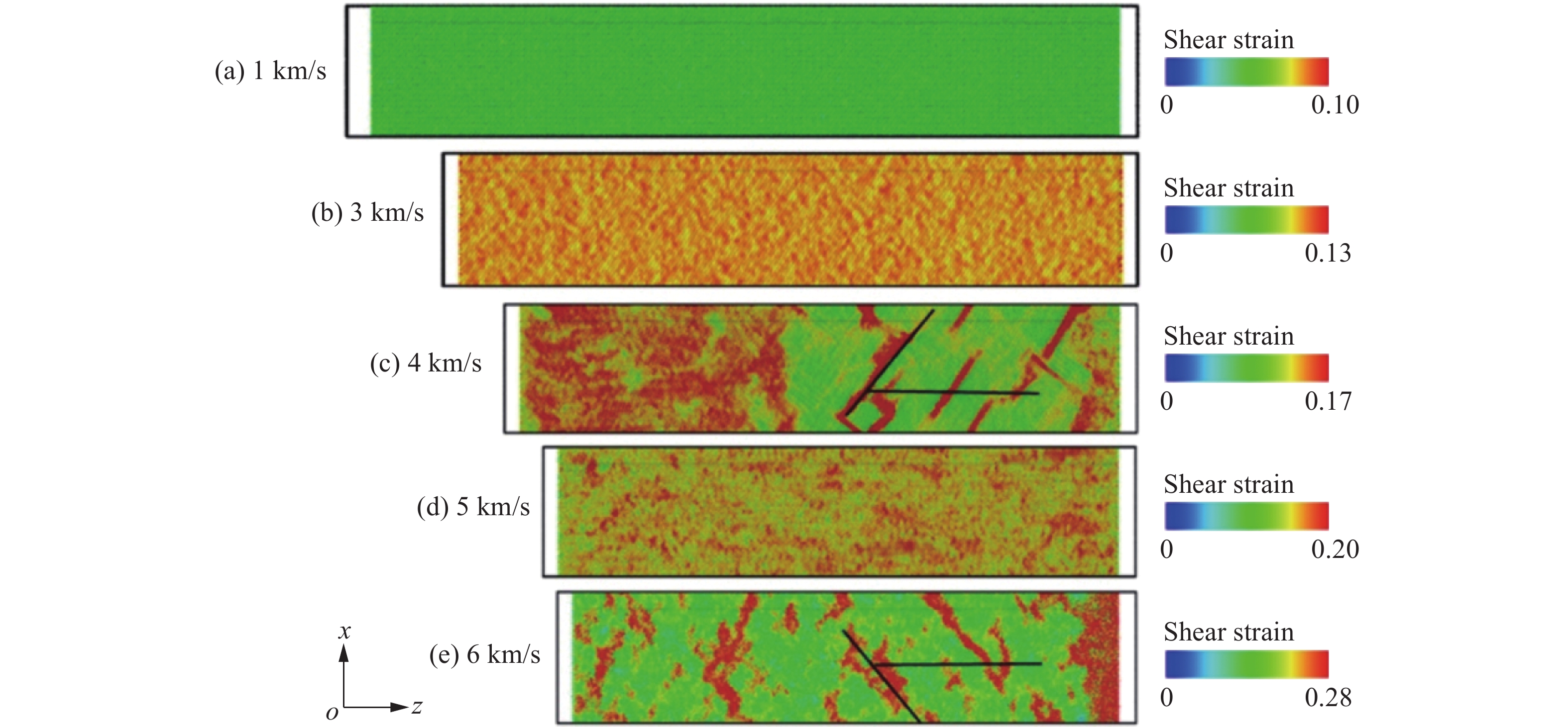 图5给出了试样内部中心截面上剪切应变的空间分布。可以看到,当冲击速度为1~3 km/s时,试样内部的剪切应变场均匀,没有出现明显的结构特征。这与图4(b)所示的1~3 km/s冲击速度下氧原子的排列情况相吻合,在此条件下,波阵面后方绝大部分氧原子仍维持初始的密排六方结构。当冲击速度增加至4 km/s时,波阵面后方出现明显的剪切应变集中,形成了宽度约为0.5~1 nm、与冲击方向近似呈50°夹角的条带状结构。当冲击速度进一步增加至5 km/s时,试样内部的剪切应变在空间上再次呈现出均匀分布。而当冲击速度达到6 km/s时,应变分布情况再次发生变化。此时,剪切应变场中出现了宽度约为2.2 nm的不规则条带结构,这些条带相互交错连接,并与冲击方向大致成45°角。该结果与Ma等[23]给出的冲击加载下金属玻璃的分子动力学模拟结果定性吻合。