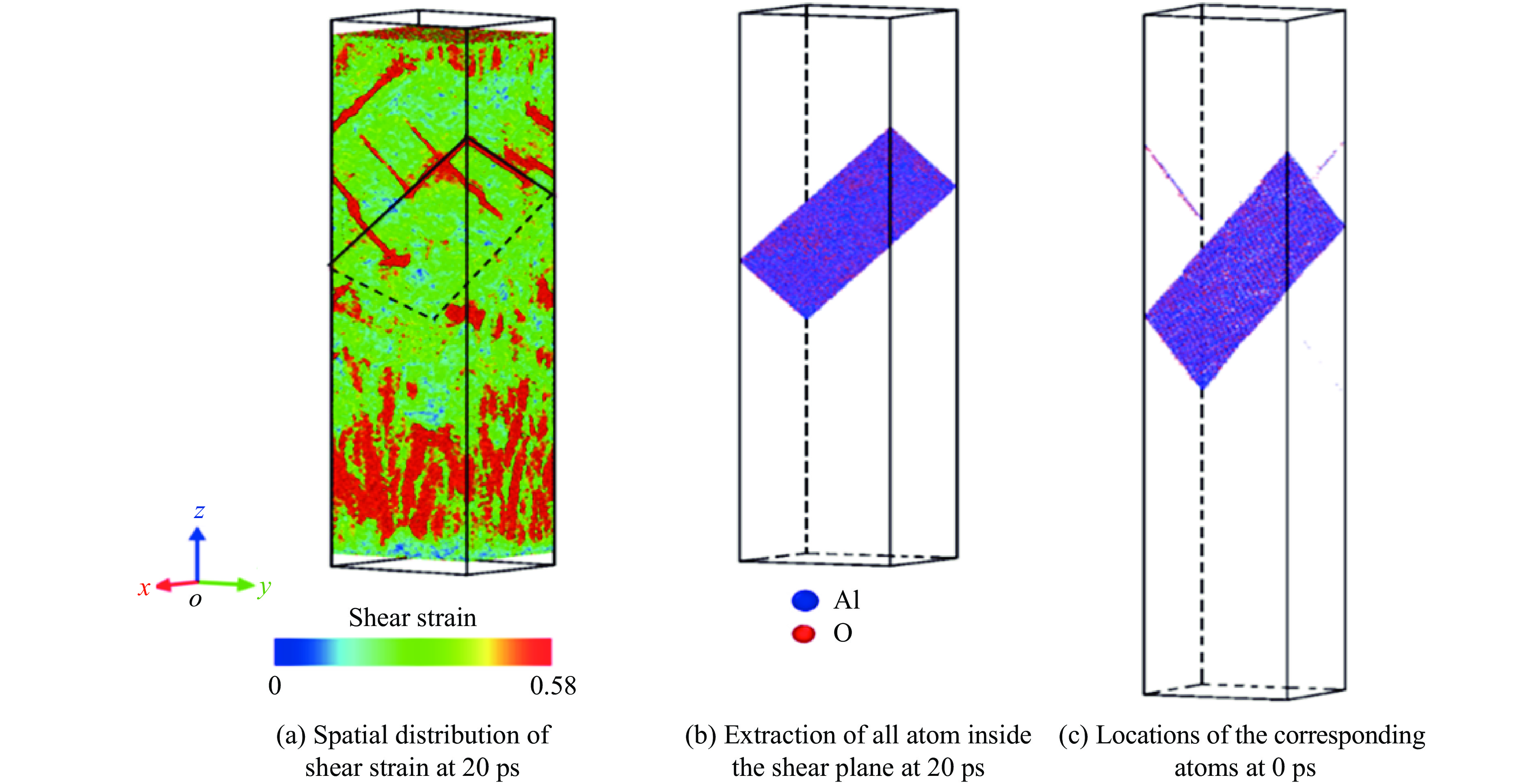 $01 \overline 1 1 $ ]。图12给出了垂直于冲击方向且与滑移面相交的截面上的剪切应变空间分布。图12(c)为零时刻截取的平面上的原子在20.0 ps时的位置与剪切应变的关系,可以看到,在应变集中的区域,原子在滑移带上呈现出明显的上下位移,并且2个特征氧原子相互远离。从图12(b)和图12(c)可以看出,沿滑移方向,应变集中区域扩展,应变增大。