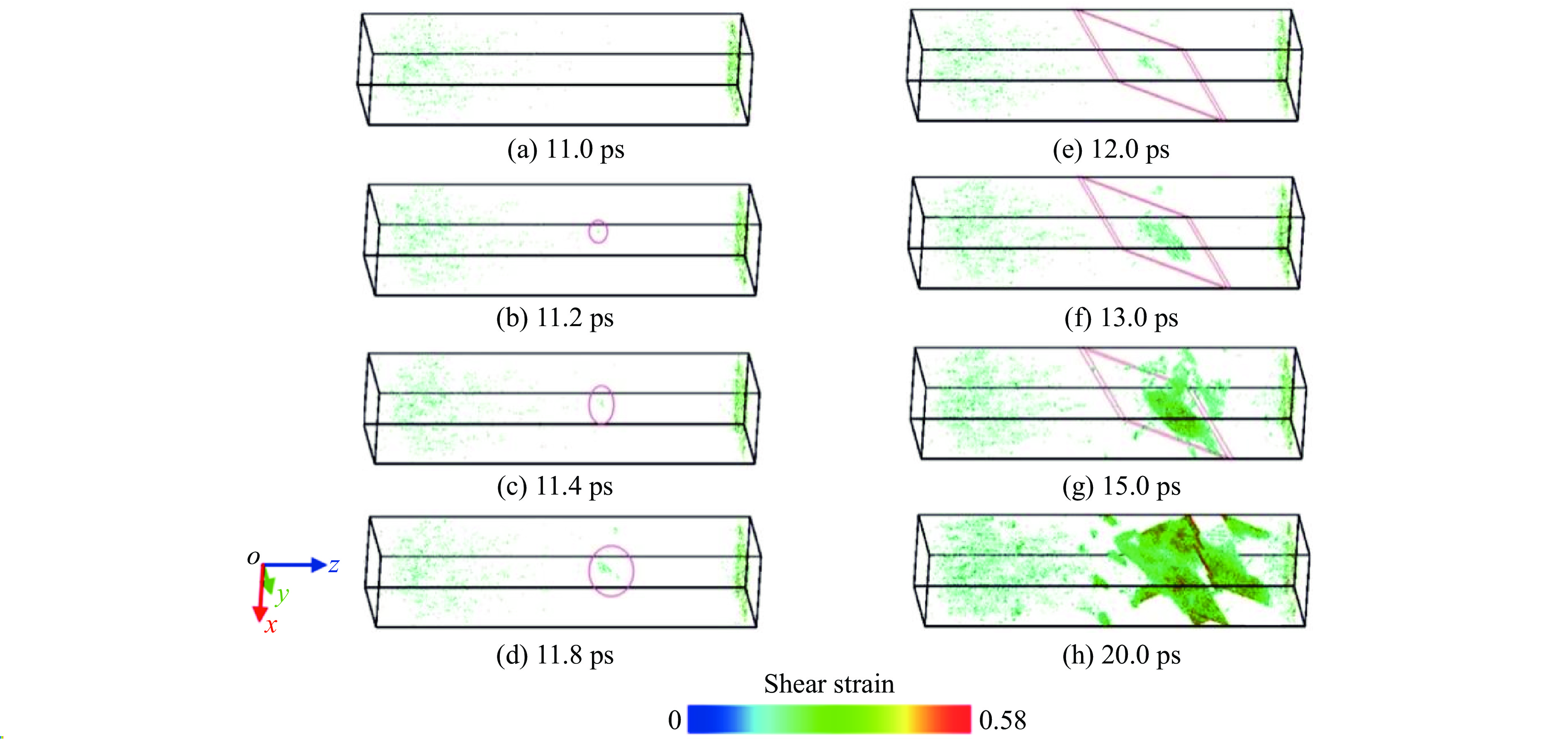 $0 \overline 1 12 $ }。图7给出了图6所示的4 km/s冲击条件下滑移带的形成和演化过程,图中的颜色代表剪切应变。为便于三维可视化,图7中仅给出了剪切应变大于0.18的原子。可以看到,在约11.2 ps时试样中后部出现了一个局部高剪切应变区,见图7中红圈所示;随着加载的进行,该高剪切区域沿与冲击方向成一定夹角的平面(见图7中12.0~15.0 ps时的红色方框区域)逐渐向前扩展,最终形成完整的滑移带(见图7中20.0 ps时的情形)。
