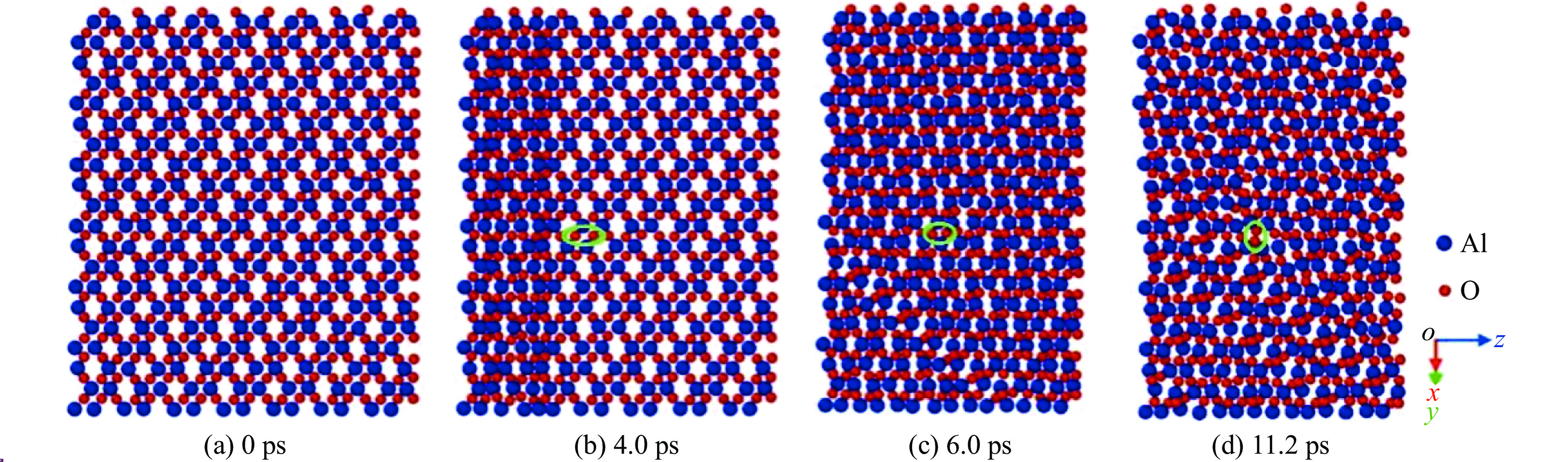$0\overline 1 12 $ )晶面(R面)冲击下的发光辐射特性,高速摄像结果表明:蓝宝石中发光的热点并不是均匀地分布在整个冲击截面上,而是集中在某些局部区域;相同冲击压力下,沿R面的辐射发光强度要低于沿A面和C面的辐射发光强度,因此,推测蓝宝石材料中非均匀热点的形成可能与材料内部形成的剪切带有关。受检测手段的限制,目前还难以通过实验在线精细刻画冲击加载下试样内部的损伤演化过程。随着计算能力的提升以及相关力学理论的完善,越来越多的学者采用数值模拟来探究和刻画冲击加载下材料的力热响应特性。在诸多模拟方法中,分子动力学(molecular dynamics, MD)模拟能够从原子/分子层面揭示材料的力-热-反应响应行为,得到了诸多学者的关注。Le等[5]基于分子动力学模拟研究了蓝宝石在45 GPa压力条件下冷却过程中的相变过程,模拟结果表明:在高温条件下会出现γ-Al2O3和k-Al2O3;当温度降低至300 K时,γ-Al2O3会转变为δ-Al2O3,k-Al2O3转变为α-Al2O3。Zhang等[6–8]采用包含高达5.4亿个原子的大规模分子动力学模拟研究了α-Al2O3在高速冲击载荷下的变形机制,分析了冲击加载过程中裂纹萌生过程、结构相变、撞击点附近高应变率变形模式等。