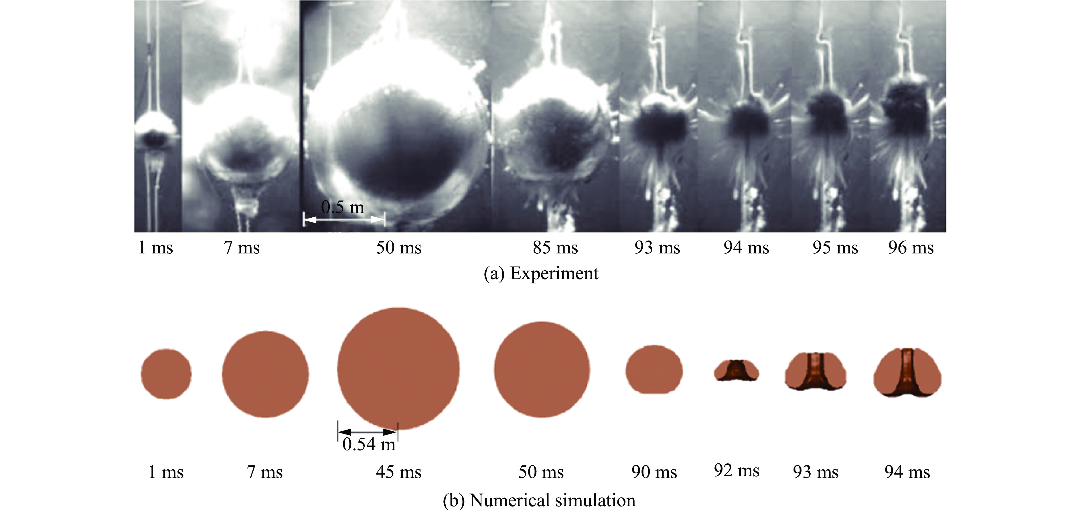 采用Klaseboer等[25]的水下爆炸实验对水下爆炸气泡载荷模型进行验证。实验中,装药采用TNT炸药,药量为55 g。数值仿真采用1/4模型。水深方向的水域设定为7 m,在自由液面上方设置高度为0.5 m的空气域;其余2个方向设定为4.5 m。球形TNT装药的半径为19.95 mm,起爆方式为中心单点起爆,起爆点位于水面以下3.5 m处。在装药1.0 m范围内采用均匀网格。对称面设置为对称边界,其余面设置为无反射边界。实验与数值仿真得到的气泡脉动过程和主要结果如图1和表6所示,其中:rmax为气泡最大半径,tb1为气泡达到最大半径所需时间,Tb为气泡脉动周期。可以看出,数值仿真结果与实验结果符合得较好。