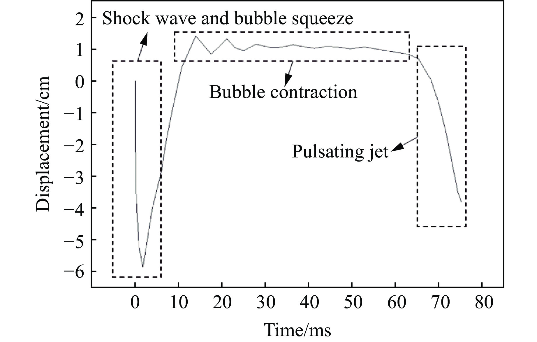 工况4的气泡脉动过程如图9所示,相应的靶板中心位移如图10所示。气泡在膨胀过程中受到靶板的反向作用力,致使其底部逐渐呈扁平状。随着气泡膨胀,气泡内部压力降低,靶板回弹。由于靶板具有弹性且边界固定,当气泡作用减弱时,气泡反向运动。随后,气泡在周围水介质的作用下开始收缩,靶板由凹陷状变为凸起状。40.0 ms时,气泡顶部受到周边水介质的挤压作用逐渐呈现柱状。随后,气泡在水介质的持续作用下继续形变,65.0 ms时,气泡近似分为3个部分,中部与底部的连接处存在朝向气泡内侧的较大凹陷。70.0 ms时,凹陷部分破裂,产生向下运动的高速射流,射流对靶板产生较大的沿重力方向的作用力,因此,靶板向下运动产生凹陷。因此,层合板在气泡载荷作用下产生振荡,而CFRP层增强了面板和背板的整体强度,有效地减小了结构变形。
