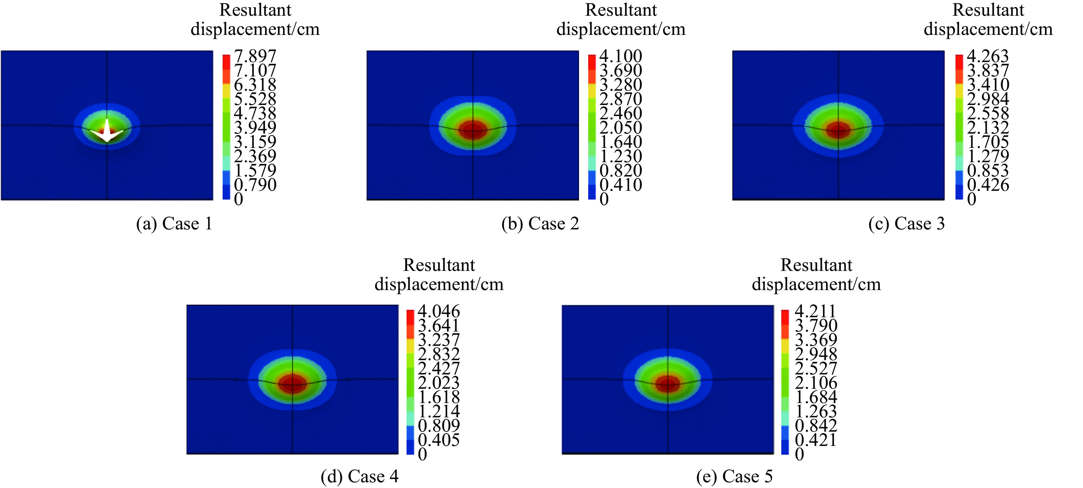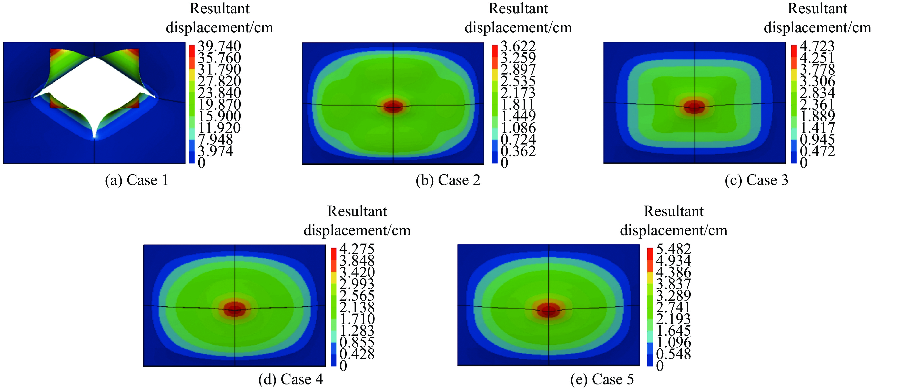 终止时刻5个工况的靶板位移如图11所示。其中,裸钢板工况采用自下而上的视角,其余为相反视角。钢板在气泡脉动作用下产生大幅开裂翻卷变形,形成大面积破口。翻卷端部在3个方向均产生了较大的位移,其中厚度方向的位移为210 mm。层合板只出现挠度变形,而未发生破口或撕裂现象。80.0 ms时,工况2的凹陷变形幅度最小,中心处为36.22 mm。按照中心位移由小到大,依次为工况2、工况4、工况3和工况5。