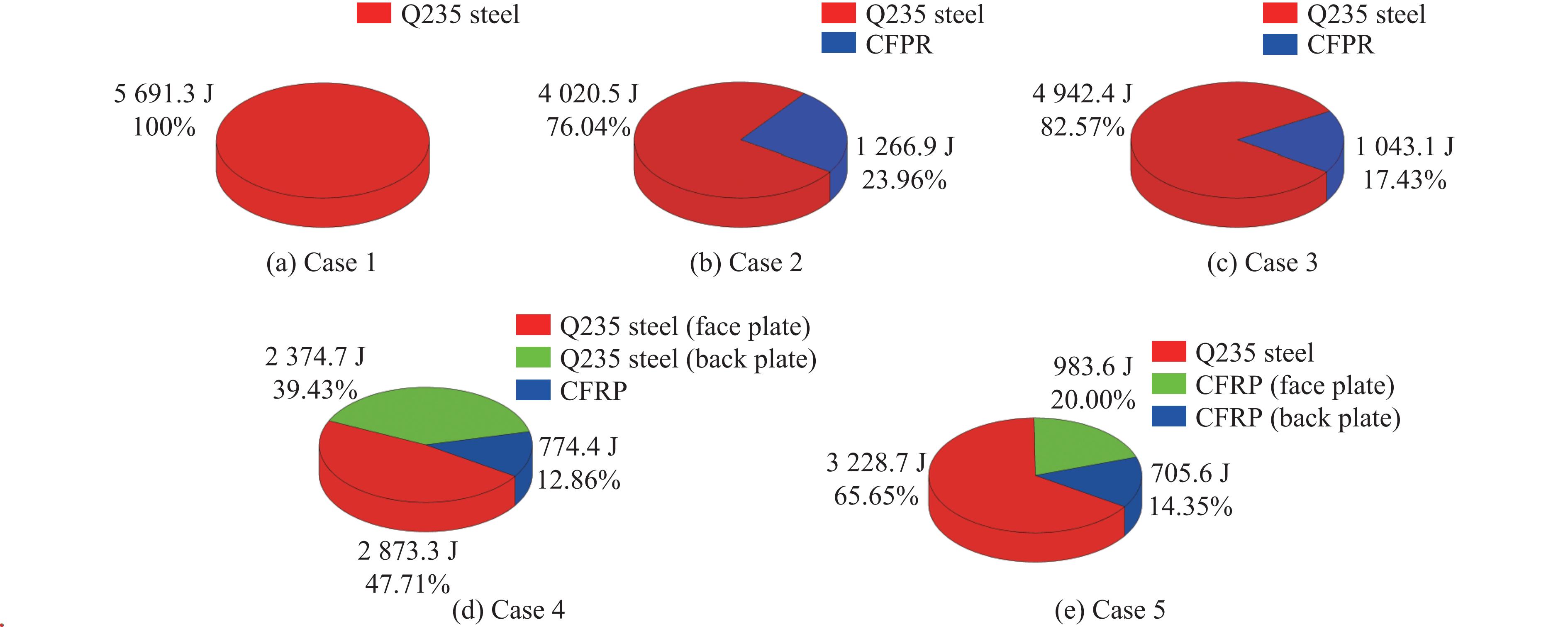 $ {E}_{\mathrm{t}\mathrm{o}\mathrm{t}} $ 为靶板总内能,如表10所示;$ {E}_{\mathrm{s}\mathrm{t}\mathrm{e}\mathrm{e}\mathrm{l}} $ 为工况1中裸钢板的内能(5691.3 J )。图12给出了5种工况下靶板中钢板层和CFRP层的内能及其占比。层合板工况中,钢板层的吸能占比均超过CFRP层的吸能占比,说明层合板结构中Q235钢为主要吸能材料。这是因为CFRP的强度较高,不易发生变形,而钢板在变形过程中消耗了更多的能量。迎爆面为CFRP的工况2和工况5中,层合板内能低于等面密度条件下的裸钢板,其中:工况5中不仅钢板层的吸能大小和占比均为5种工况中最低,而且总内能也最低。在工况3和工况4中,结构吸收的总能量超过裸钢板,说明适当厚度的CFRP层能够提升层合板单位面质量的能量吸收性能。以上分析表明,在等面密度的情况下,工况4中的钢/CFRP/钢3层夹芯结构的吸能最高,抗爆性能最佳。