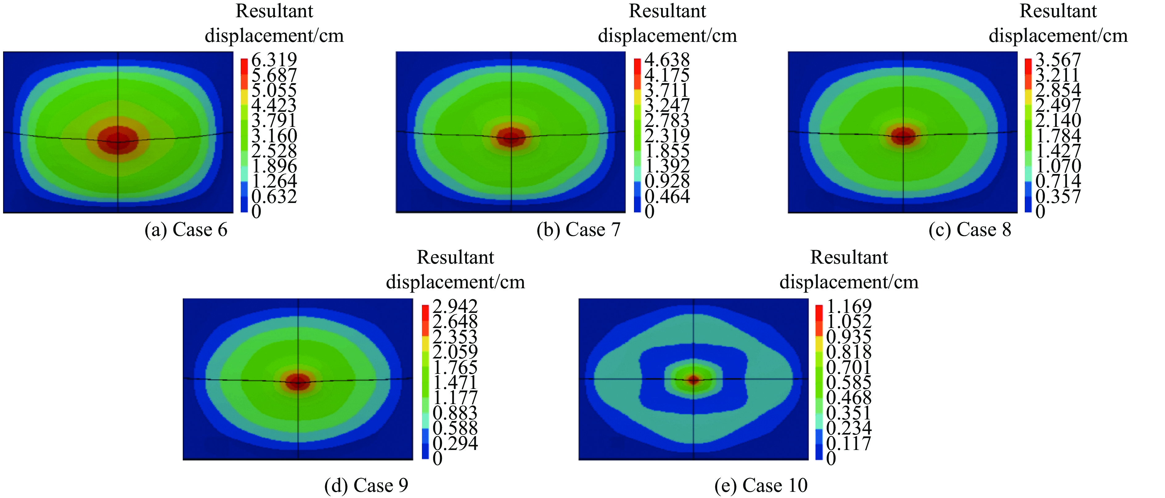 观察不同厚度层合板在气泡脉动过程中Dz随时间的变化,可以看出:在厚度最小的工况6中,层合板位移达到最大值后,虽然有所减小,但是在计算终止之前的整个气泡脉动过程中,靶板始终处于凹陷状态;其余4种层合板中,在气泡脉动过程中,靶板变形与3.2节的结果一致,均呈现凸起-凹陷反复振荡现象。在层合板变形过程中,随着厚度的增加,CFRP层大大增强了结构的整体强度,无论处于凹陷状态,还是凸起状态,其位移大小均呈减小趋势,整体变形过程中波动较小,说明增加CFRP的厚度能有效增强结构的稳定性。