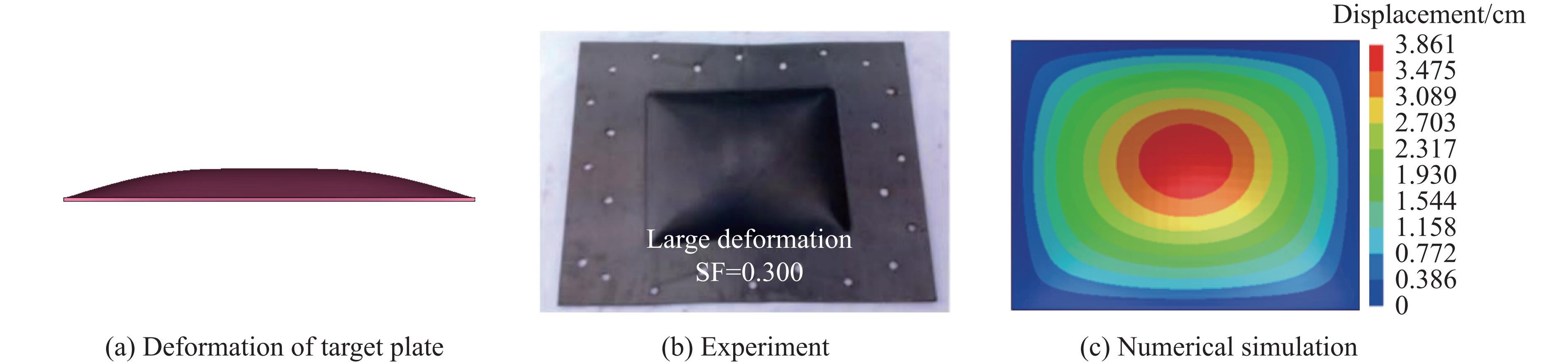 实验和数值仿真得到的靶板变形情况如图2所示,其中SF(shock factor)表示冲击因子。在平板变形过程中,首先,在刚固边界处产生转角,形成塑性铰环。随着载荷的持续施加,塑性铰环向靶板中心收缩,塑性铰环内部(靠近中心部分)类似刚体做平移运动,塑性铰环外部则形成曲面板,如图2(a)所示。由于载荷并未使靶板达到极限应变,因此,塑性铰环收缩至靶板中心处停止,并未产生剪切断裂[27],变形模式与实验结果基本吻合。在挠度方面,实验得到的靶板中心挠度为0.04 m,数值仿真结果为0.038 m,相对误差为5%。上述结果表明,采用ALE方法计算水下爆炸对结构的毁伤具有很高的可行性。