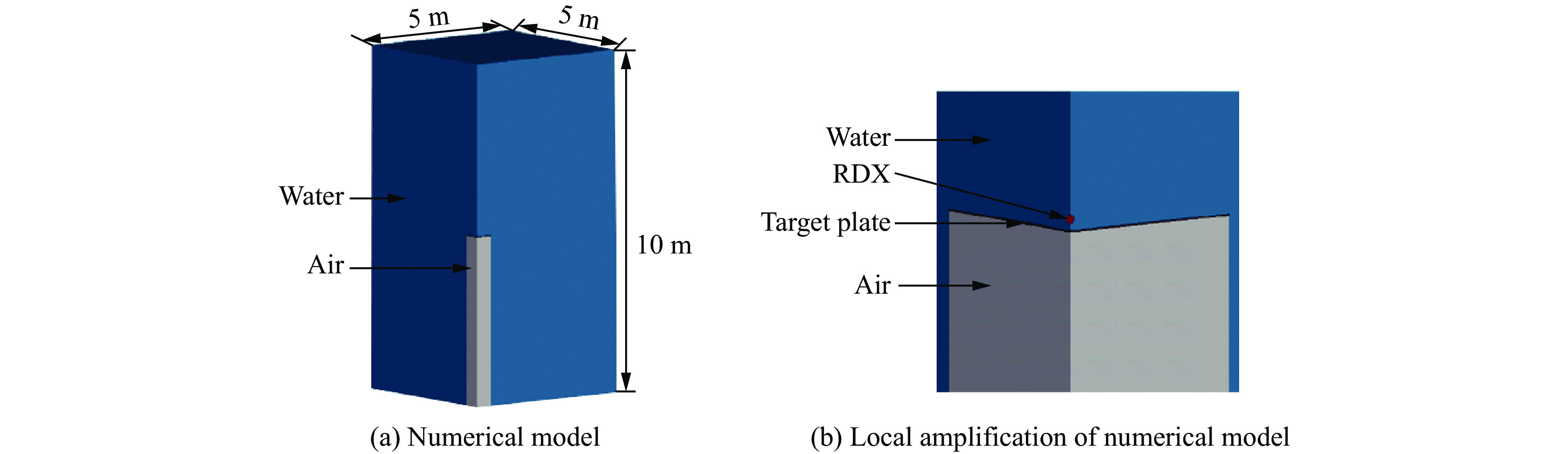 采用Ramajeyathilagam等[26]的水下爆炸冲击背空矩形薄板实验验证水下爆炸与结构的流固耦合问题的有效性。实验在尺寸为15 m×12 m×10 m的水箱中进行,装药为10 g PEK I (11.7 g TNT)炸药。靶板采用背空板,暴露在空气中的尺寸为0.30 m×0.25 m,厚度为2 mm,材料为低碳钢。装药和靶板通过固定装置固定在2 m水深处,炸药处于靶板中心的法线上,距靶板0.15 m。TNT和低碳钢的材料参数见表7和表8。