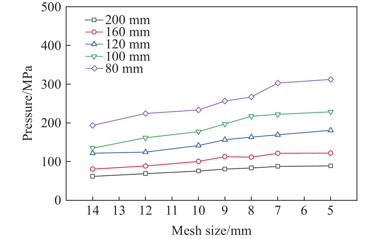 为了分析水下爆炸载荷作用下金属/CFRP复合层合板的响应,建立有限元模型,如图3所示。考虑到模型的对称性,建立1/4模型,炸药为20 g球形RDX,位于水面以下5 m处,中心单点起爆。水域尺寸设定为10 m×10 m×10 m。方形靶板的尺寸为1 m×1 m,设为背空板。装药球心距靶板上表面的距离h为30 mm。ALE域的对称面设置为对称边界,其余面设置为无反射边界。同样,设置靶板的对称面为对称边界,其余面为刚固边界。为了提高计算效率,装药四周0.5 m范围内采用均匀网格划分。对均匀网格尺寸进行收敛性分析,分别选取网格尺寸14、12、10、9、8、7和5 mm,记录不同爆距处的冲击波峰值压力,结果如图4所示。从图4可以看出,从7 mm开始,5个不同爆距处的冲击波峰值压力趋于稳定,说明数值计算结果已经收敛。因此,均匀网格尺寸选择7 mm,其余部分采用变化率为0.16的渐变网格。