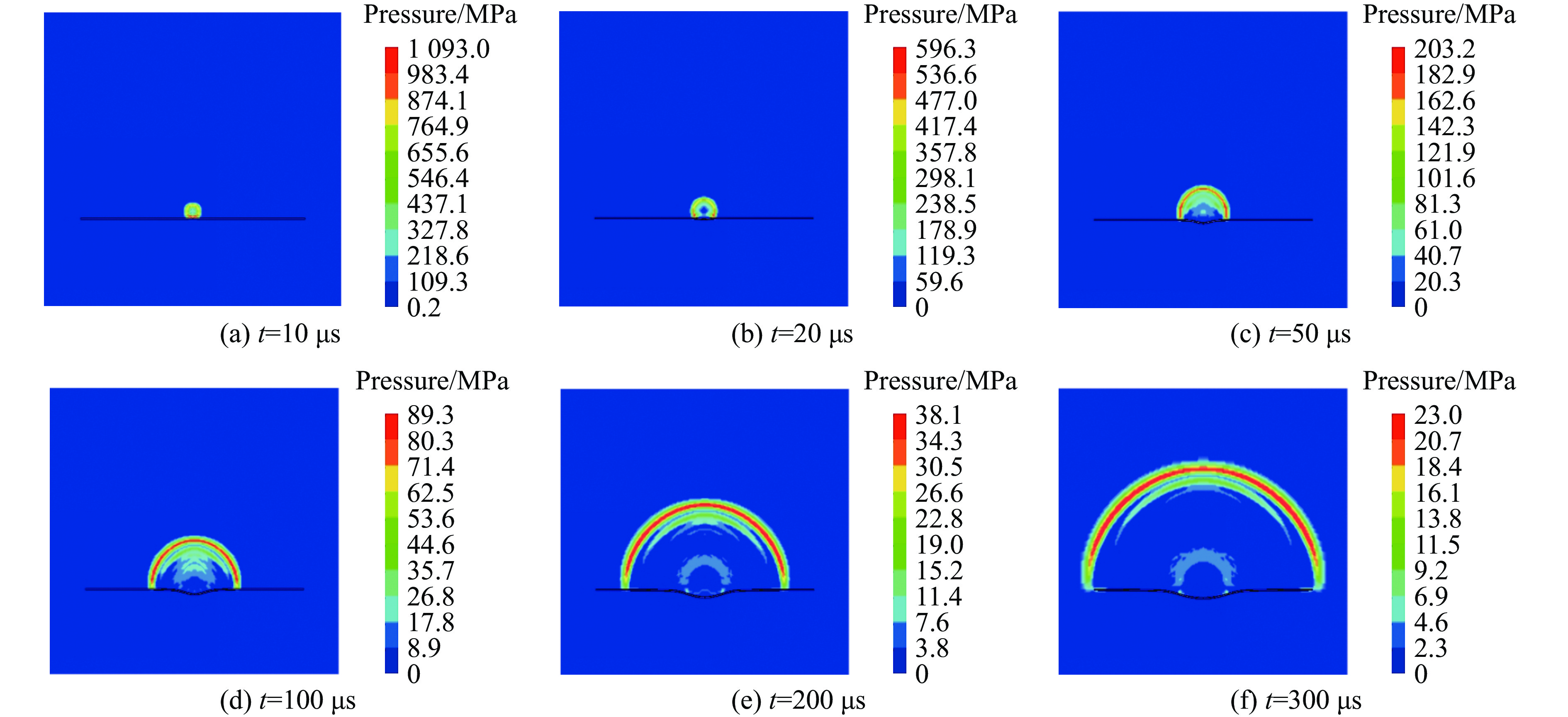 以工况4为例,水下爆炸产生的冲击波压力云图如图5所示。冲击波传播到靶板上表面时会发生反射和透射现象。由于靶板背空,透射的冲击波在空气介质中迅速消散,因此,靶板背面压力无明显变化。10 和20 μs时,由于靶板的反射作用,靠近靶板处的冲击波压力较大,随后反射波转变为稀疏波。随着时间的增加,冲击波以球面波的形式沿靶板表面向外传播,300 μs时传播至靶板边缘,对靶板作用基本结束。