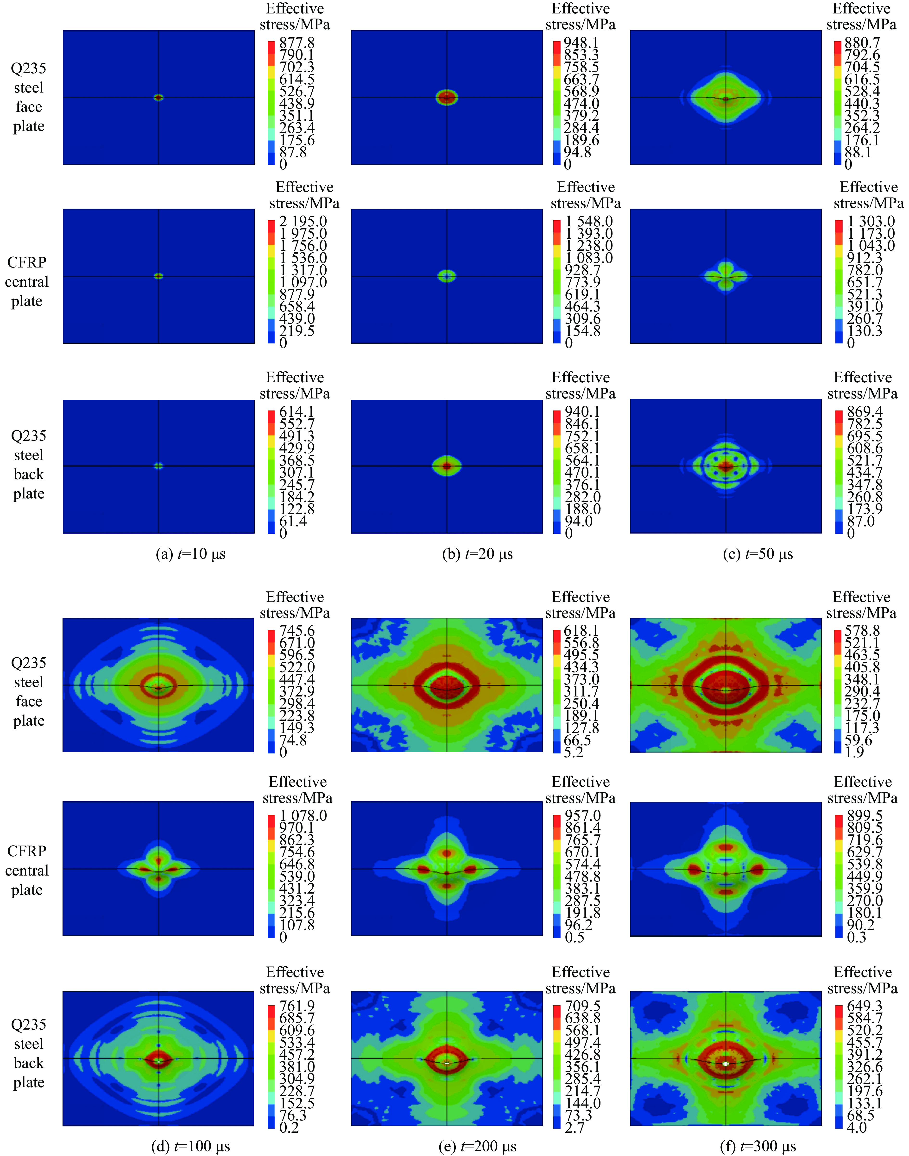 (2) 采用CFRP-钢铺层方式时,层合板的位移最小,变形程度最低;钢-CFRP-钢次之。在吸能效果方面,4种不同铺层方式的层合板中,钢-CFRP-钢铺层方式的吸能最大,抗爆性能最优。在层合板结构中,Q235钢为主要吸能材料,吸能占比较大,而CFRP主要起支撑结构、减小变形的作用。