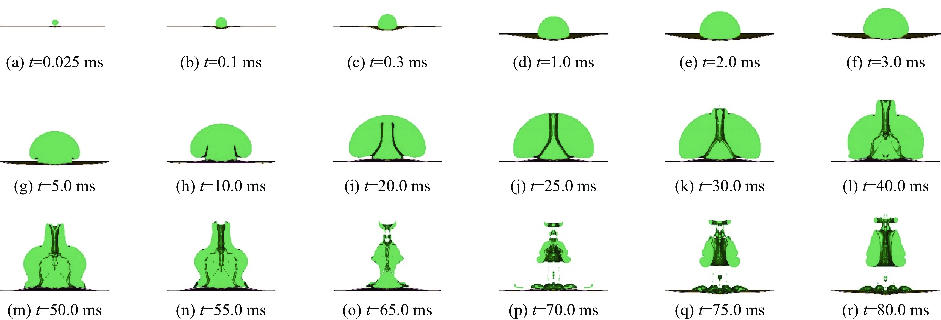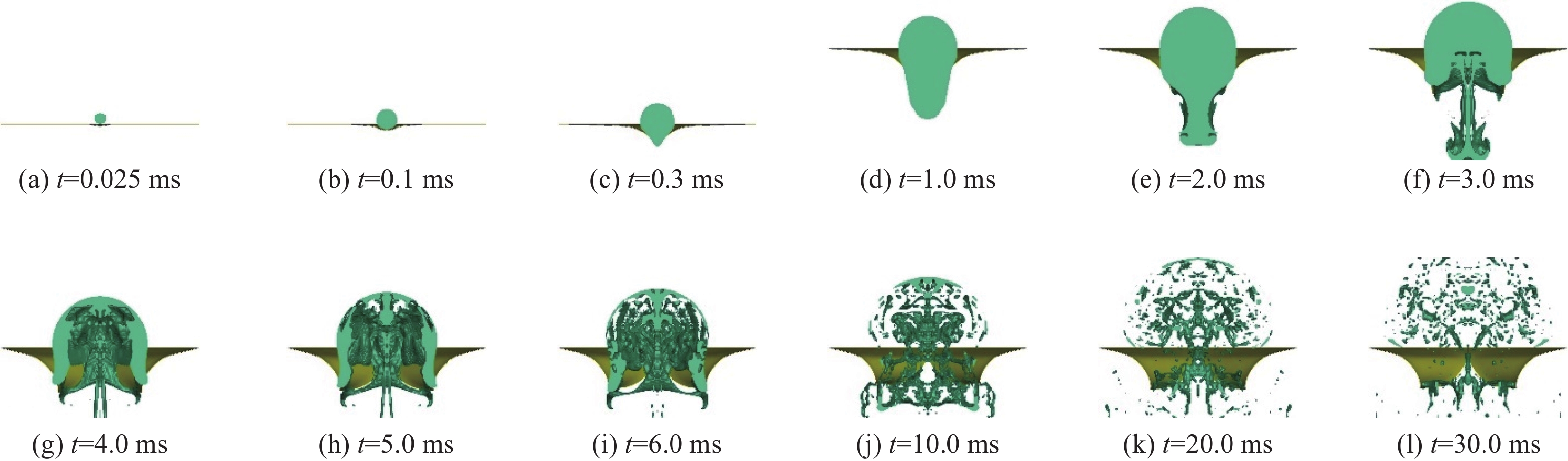 气泡脉动是水下爆炸作用下结构遭受的另一种载荷形式,其作用时间往往在毫秒量级,远远大于冲击波载荷作用时间。图8显示了工况1中气泡的脉动过程。0.025 ms时,气泡半径与爆距基本相同,靶板中心在冲击波和气泡膨胀挤压的作用下产生向下凹陷。0.1 ms时,靶板已出现破口,气泡从破口处向下运动,挤压靶板使其逐渐产生花瓣开裂。由于靶板为背空板,因此,空气涌入气泡,将其分为上、下两部分,而后逐渐发生破碎。气泡破碎后,其对靶板的挤压作用大大减弱,靶板在气泡脉动过程中维持花瓣开裂状态。30.0 ms时,计算终止,气泡已基本全部破碎。