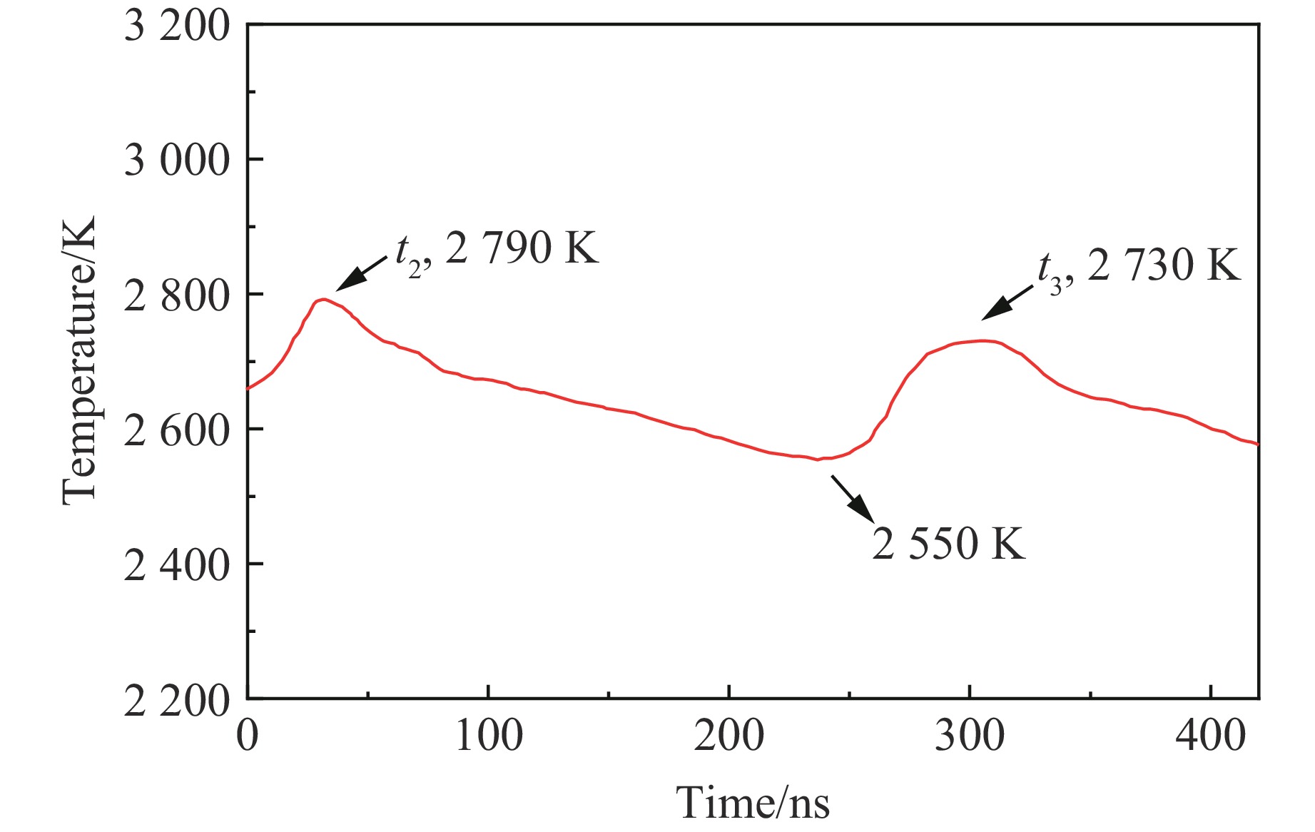 2790 K衰减到2550 K,降低了240 K,随后在t3时刻界面受到第2次冲击加载,界面温度再次跃升到2730 K,最后缓慢下降。由图6(b)所示的压力曲线可知,界面压力经历了衰减过程,压力从25 GPa降至18 GPa,其最高峰值明显低于文献[26–27]的爆轰压力。在本实验中,样品温度测量值也未达到文献[28]报道的爆轰温度(3400 K),可见爆轰过程需要足够高的温度和持续时间才能完成能量的充分释放。温度测量值低于稳定爆轰温度,说明在本次实验中,样品处于爆轰前的化学分解和热释能阶段。在此过程中,样品热辐射的发射率仍然小于1,也间接反映出在观测界面上存在某些发光较弱的区域,即处于不同区域的炸药样品的能量释放程度有所差异。 -