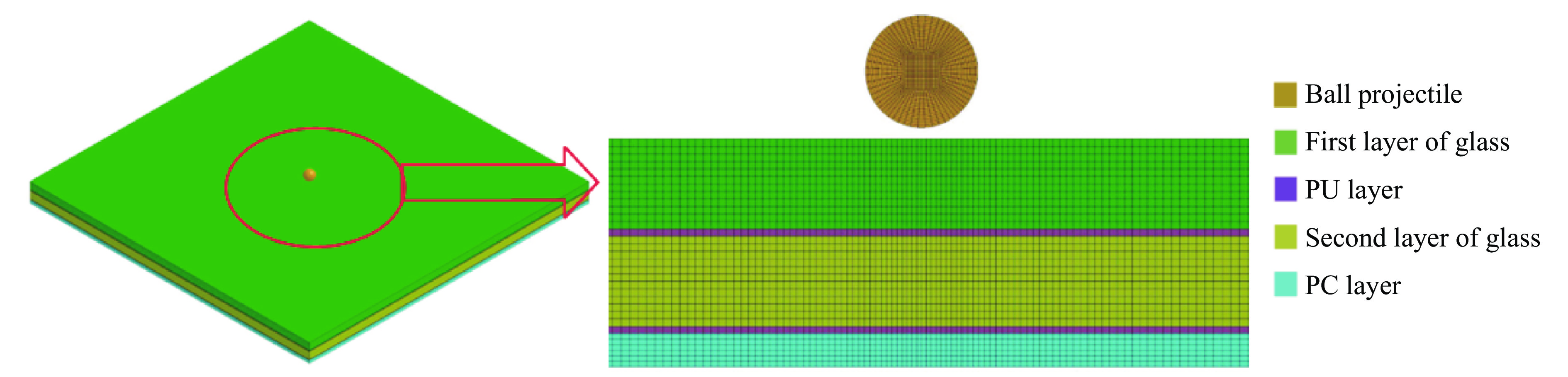 玻璃复合装甲具有一定的透明度,且能够有效抵御子弹、炮弹、爆炸碎片等威胁而不被穿透,被广泛应用于军用车辆、战斗机、直升机、军舰等装备[1–3]。其中,车用玻璃复合装甲通常由无机玻璃、黏结层和高聚物背板组成[4]。然而,与常规金属装甲相比,玻璃材料存在抗拉强度低、脆性大等弱点,在碰撞后容易发生破坏和破碎[5]。因此,研究玻璃复合装甲在弹丸高速冲击作用下的损伤机制十分必要。