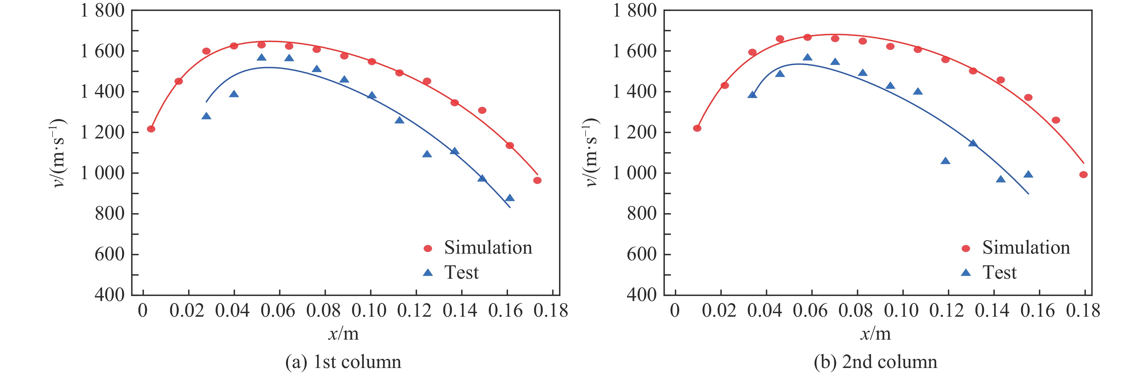 选取相邻两列预制破片作为研究对象,提取数值模拟得到的速度数据,并与试验测得的破片飞散速度进行对比,结果如图14所示,其中:x为破片轴向位置。相邻两列破片的最大速度分别为