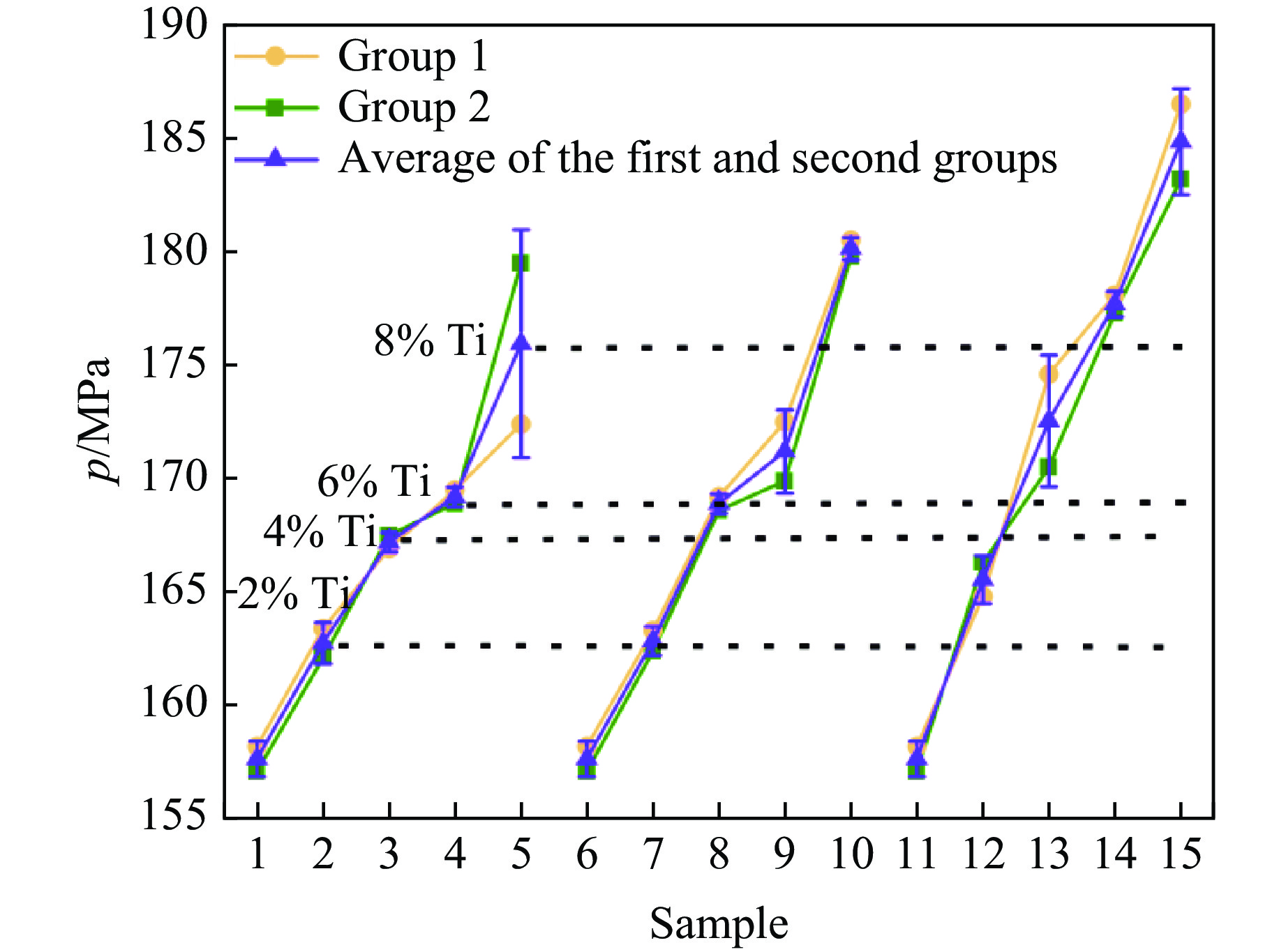 Sample Mass/g ωTi/% OB/(g·g−1) KClO4 C2H8N2O4 C7H6O3 Ti 12 82.439 35.366 11.146 2.6 1.97 0.00001 13 82.439 35.366 10.036 5.2 3.90 0.00001 14 82.439 35.366 9.013 7.8 5.78 0.00001 15 82.439 35.366 7.952 10.4 7.62 0.00001 16 82.439 35.366 6.894 13.0 9.44 0.00001 表 4 试验样品的峰值压力数据