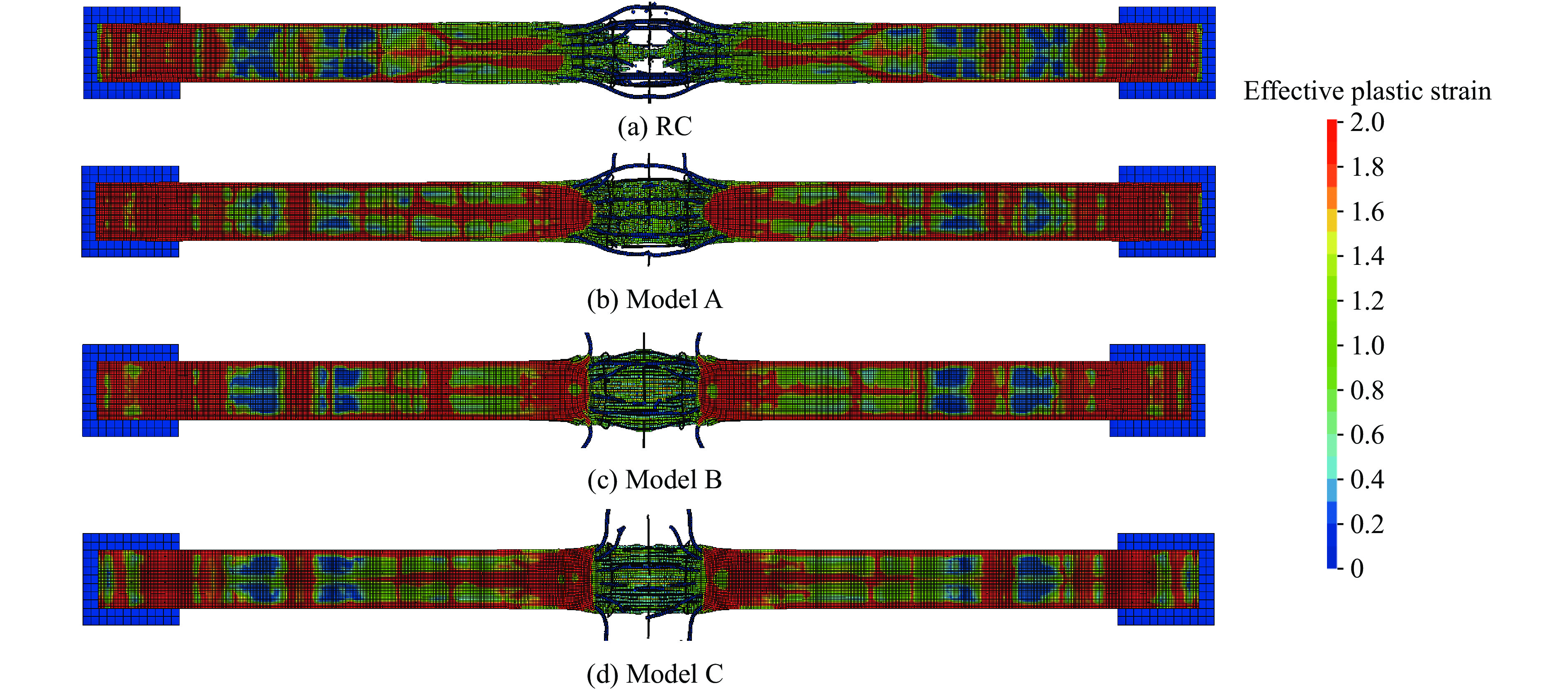 在Model C中,爆点处迎爆面形成了最深达167 mm的爆炸坑,迎爆面混凝土破坏面长度为712 mm,背爆面混凝土完好无剥落,混凝土单元变形很小;迎爆面中间3根纵筋断裂,外侧2根纵筋发生弯曲;中间1根箍筋上侧散开,其他基本完好;侧面纵筋基本无弯曲,混凝土只有表层存在较多剥落,其他位置的剥落情况相对很少。