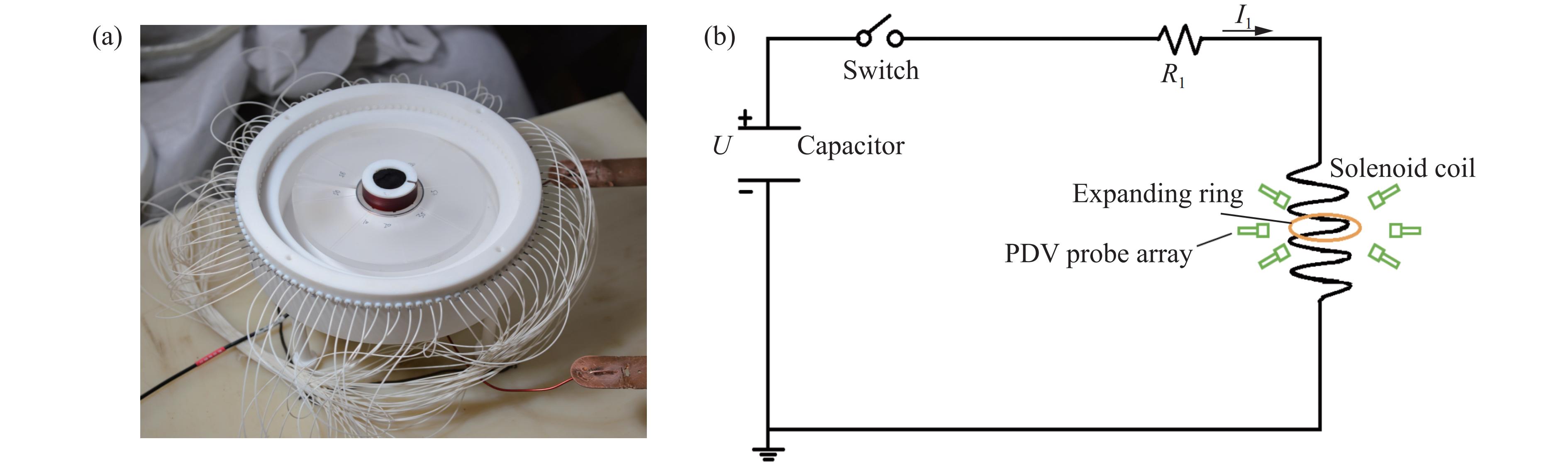 Niordson[5]发展的电磁膨胀环实验技术被广泛应用于金属材料的动态断裂行为研究,具有应变率易调、操作简便、重复性好等优势,且可配套多种诊断技术以获得金属电磁膨胀环的断裂应变。学者们最初通过测量回收破片的尺寸计算断裂应变,但回收过程中不可避免地会对破片造成二次损伤。Zhang等[6–7]和Janiszewski[8]利用破片回收技术研究金属延展性是否具有应变率依赖性时,甚至给出了完全相反的结论。Zhang等[6]利用高速摄影技术获得了膨胀环的断裂过程图像,但由于幅间距高达11 μs,得到的断裂应变的不确定度过大。Dan等[9]和Jiang等[10]采用磁探针获得了样品环中电压信号的突变点,但只能获得第一个断口的高精度断裂时刻。近年来,光子多普勒测速仪(photonic Doppler velocimetry,PDV)[11–15]也被用于研究膨胀环的断裂行为,但主要用于获取膨胀环的运动速度历史。