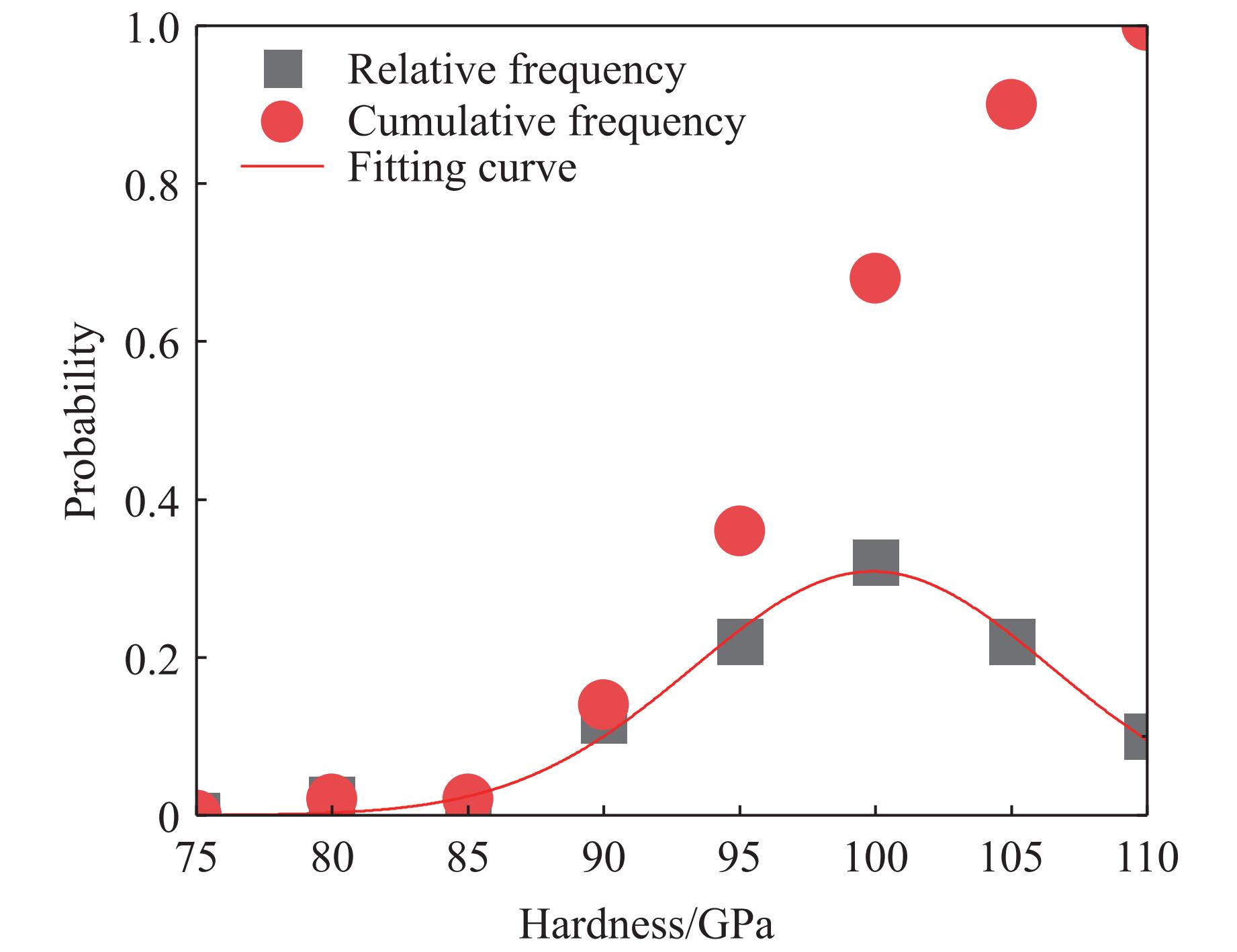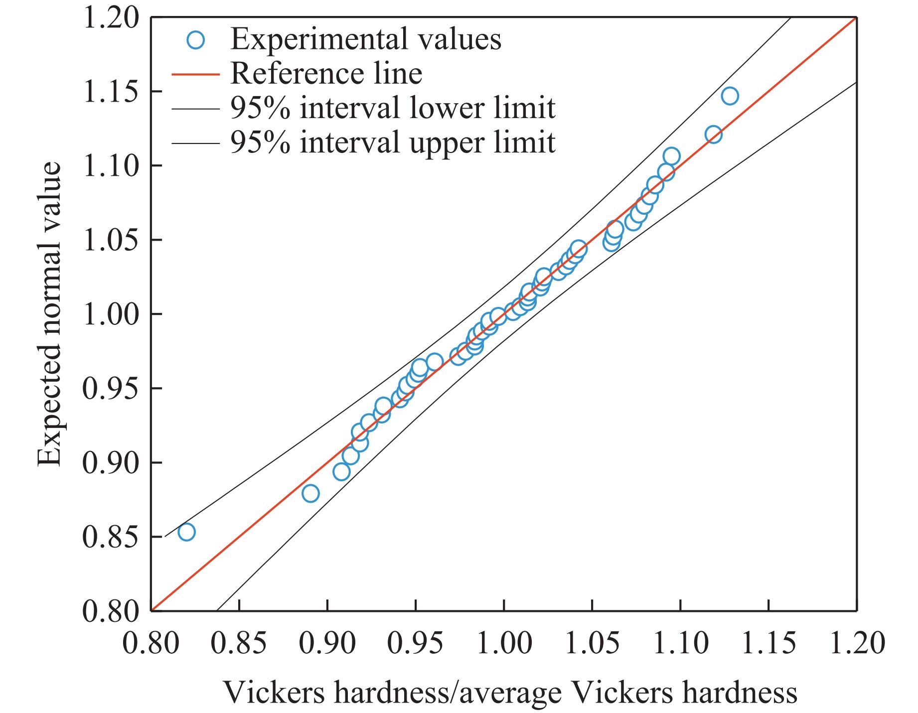 ${\sigma }_{\text{y}}' $ 为特定单元的屈服应力。每个单元的概率因子不同,假定其满足以1为中值的分布。Cai等[19]的研究发现,韧性金属材料的硬度与准静态屈服强度呈正相关,而6061铝的动态屈服强度对应变率不敏感[18]。Altynova等[13]也发现,6061铝在不同速度下的硬度与准静态拉伸试样结果接近,因此,可以采用表征维氏硬度的方式获得材料的动态屈服强度进行统计。将表面抛光的6061铝样品环固定在显微硬度计平台上,选用10 g载荷在样品环表面等间隔测量。采用正四棱锥金刚石压头作用于样品表面,通过测量压痕区域的面积,计算材料的维氏硬度,如图8所示。实验共测得50个硬度数据,对其进行统计处理,结果如图9和图10所示。图10中,平均值μ=1,断裂应变的标准差σ=