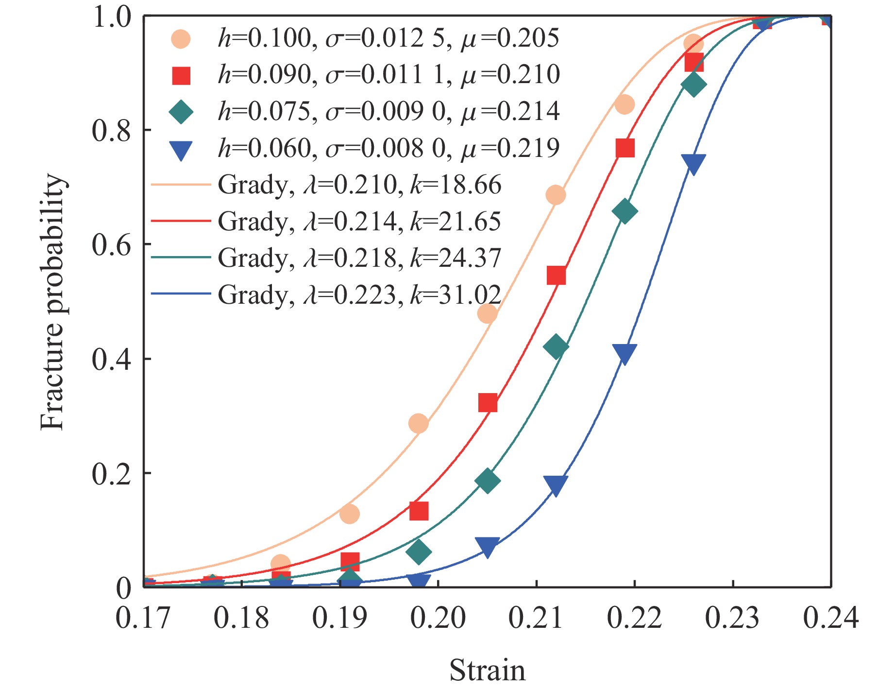 采用Grady模型对模拟结果进行拟合,结果也绘于图11。可以看出,韦伯分布可以同时较好地描述4种均匀性下断裂应变的统计规律。标准差h为0.06时,数值模拟结果拟合得到韦伯分布参数k=31、λ=0.22,与实验得到的k=33、λ=0.2吻合。
