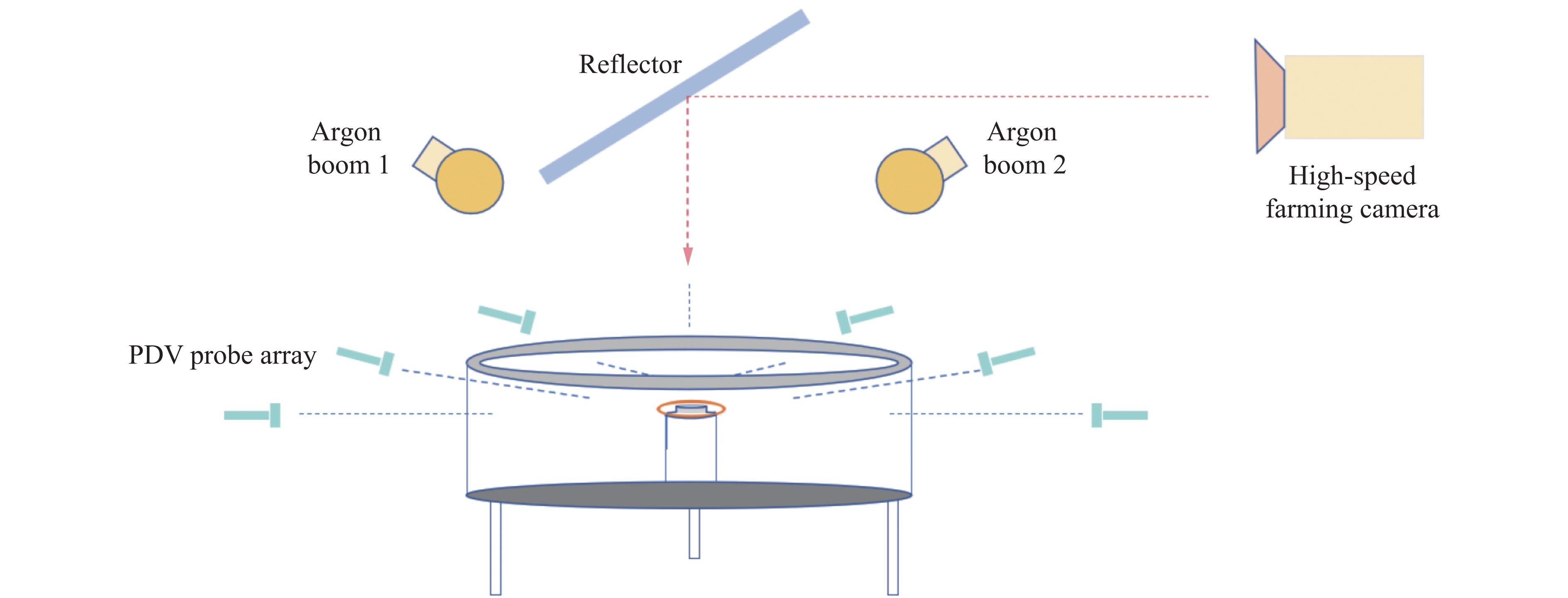 实验装置布局如图2所示。除密排PDV测速技术外,还采用高速相机从轴向拍摄样品环的膨胀断裂全过程。脉冲氙灯为高速摄影提供了充足的照明,反光镜实现光路的折转。
