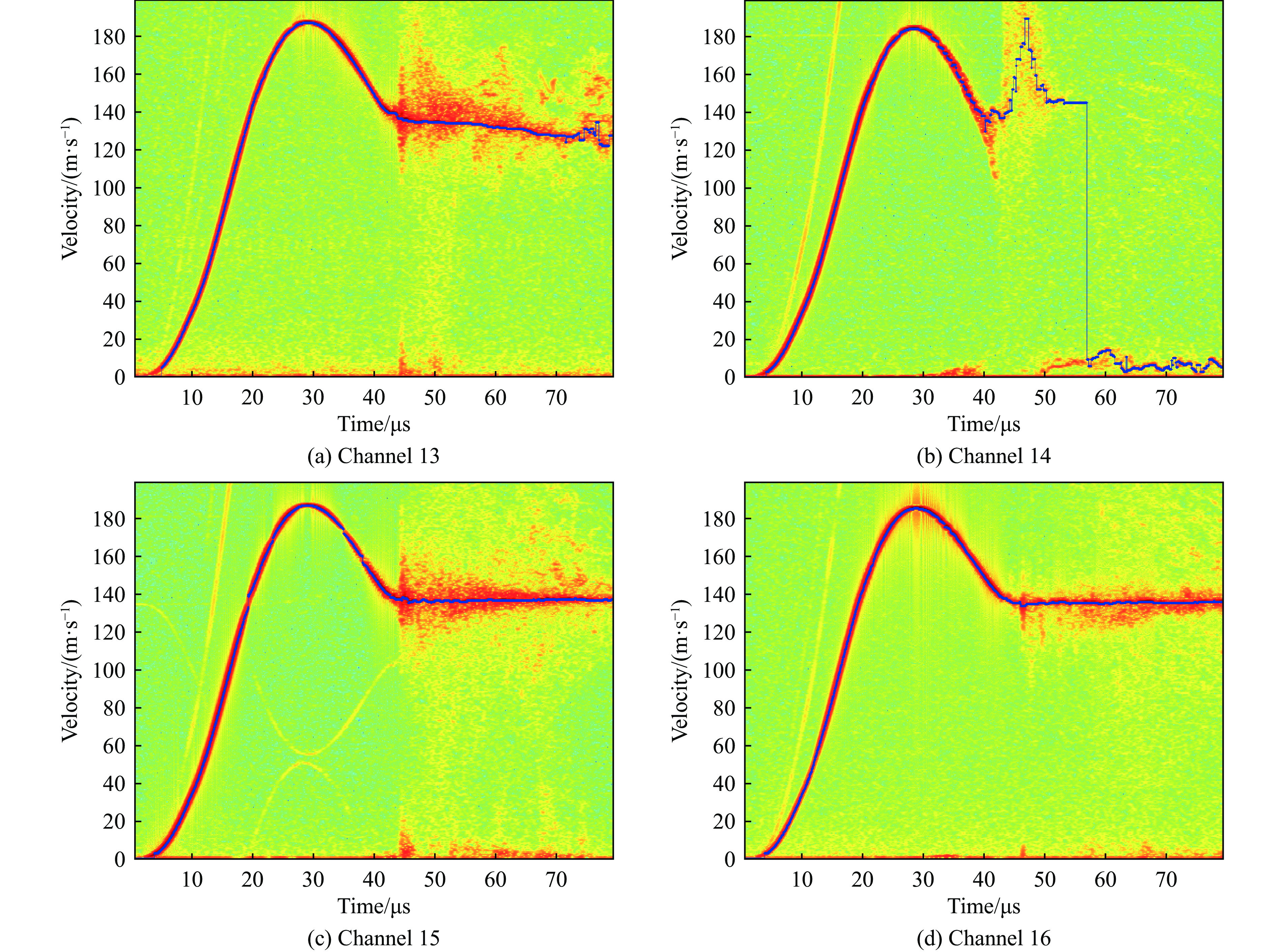 以第7发实验为例,介绍利用密排PDV阵列测试技术获得断裂时刻的方法。图3展示了相邻4个PDV探针获得的典型速度谱图,可以看出,所有速度谱图在早期均呈单一速度曲线特征,从约40 μs开始出现不同程度的弥散现象。分析认为,该弥散现象与膨胀环的断裂密切相关:膨胀环断裂瞬间,断口附近材料在高电流的烧蚀作用下变为等离子体,高速膨胀运动的等离子体导致测速谱图呈弥散特征,且越靠近断口位置,弥散程度越高。断口通常会出现在相邻2个测点之间,因此测速谱图中出现弥散信号的时刻总是晚于断裂时刻。通常等离子体的初始运动速度超过6 km/s,相邻测点的初始弧长间隔为1.2 mm,所以等离子体从断口运动到最近测速探头的时间小于0.1 μs。在本次实验中,测速通道13、14、15、16观测到弥散信号的时刻分别为42.7、42.5、42.8和43.1 μs,因此,判定最早出现弥散信号的通道14距离断口最近,该断口的断裂时刻为42.5 μs。