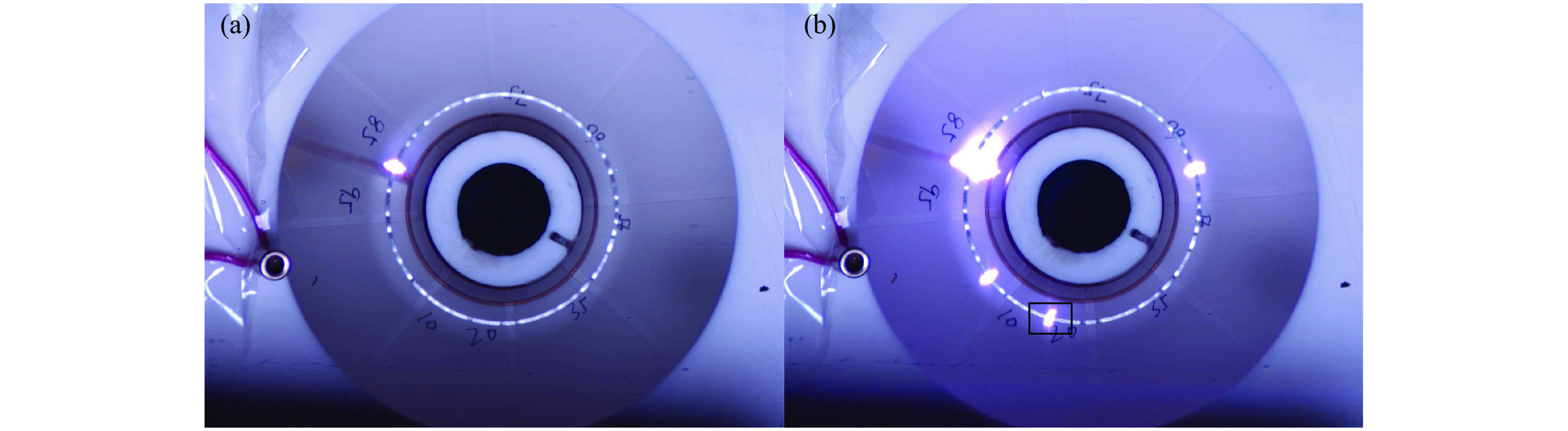 图4为40.1和43.1 μs相邻时刻的高速摄影图像,膨胀环测速编号10~20(图4(b)中的黑框区域)观测到了等离子体发光现象,与PDV测速判读的弥散信号出现时刻相符,进一步验证了速度谱图信号解读的合理性。