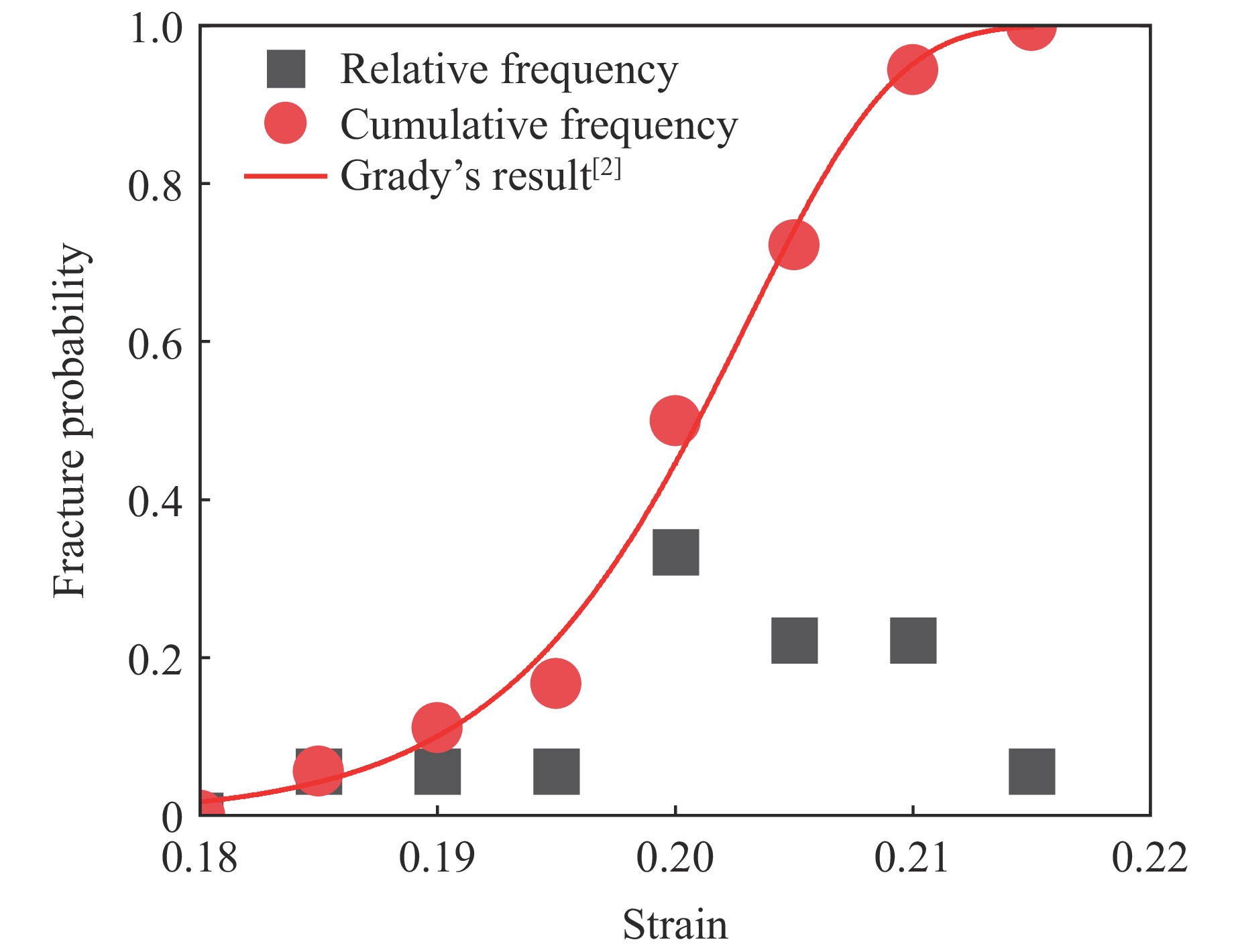 为了进一步验证Grady[2]提出的断裂应变分布,假设式(1)合理,选取实验6和实验7(最大运动速度约为180 m/s)的结果进行统计处理,将实验数据划分为8个区间,计算每个区间的相对频率和累计频率,如图6所示。可以看出,韦伯分布可以较好地描述实验数据的统计分布,韦伯分布参数中,形状参数k=33,尺度参数λ=0.2。
