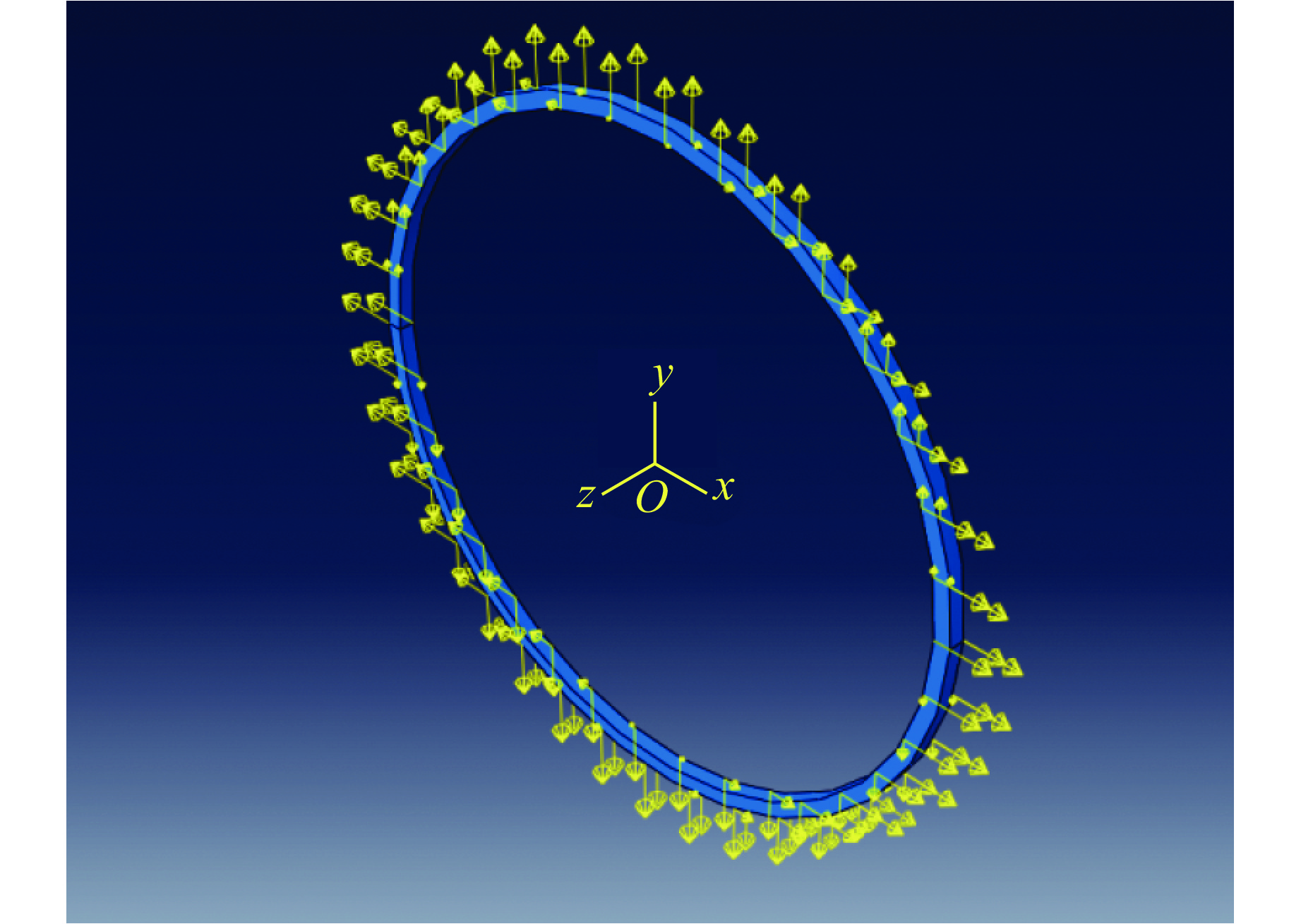 64000 。采用体力边界条件施加在样品环上,以模拟整个运动过程,体力沿膨胀环径向且所有单元均相同,如图7所示。体力曲线根据实验测得的速度曲线进行计算迭代获得。采用Zhang等[16]基于VUMAT(动力学自定义材料子程序)二次开发的材料模型进行力学场求解。材料本构模型在传统J-C模型的基础上增加了损伤软化项,采用Lovinger等[17]提出的基于能量的损伤演化模型进行计算,即