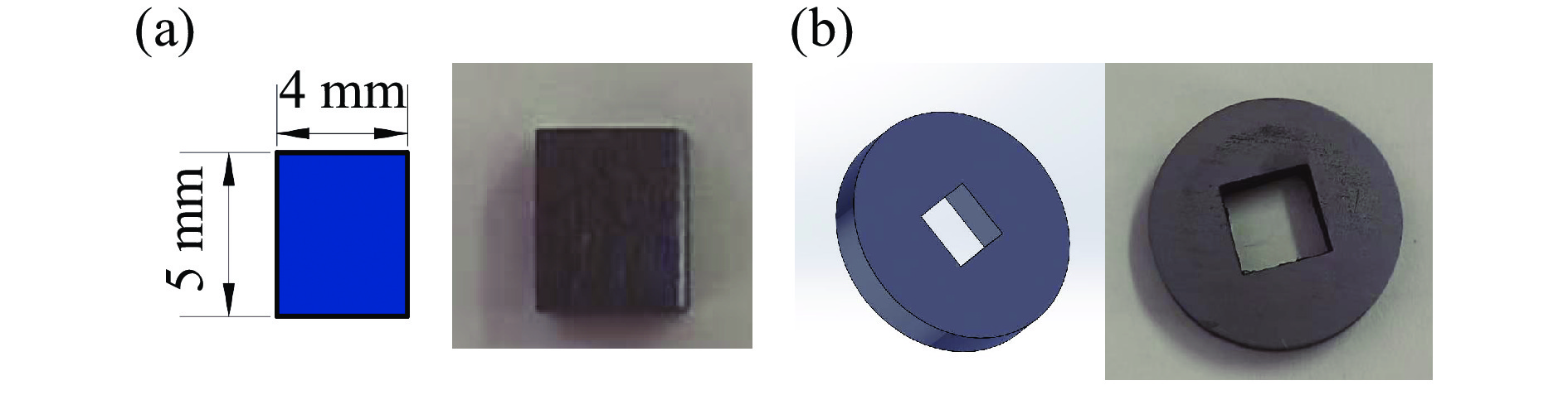 Figure 1.  (a) Schematic diagram of the theoretical dimensions and the actual object of the compressed sample; (b) schematic diagram and the actual object of the stop ring