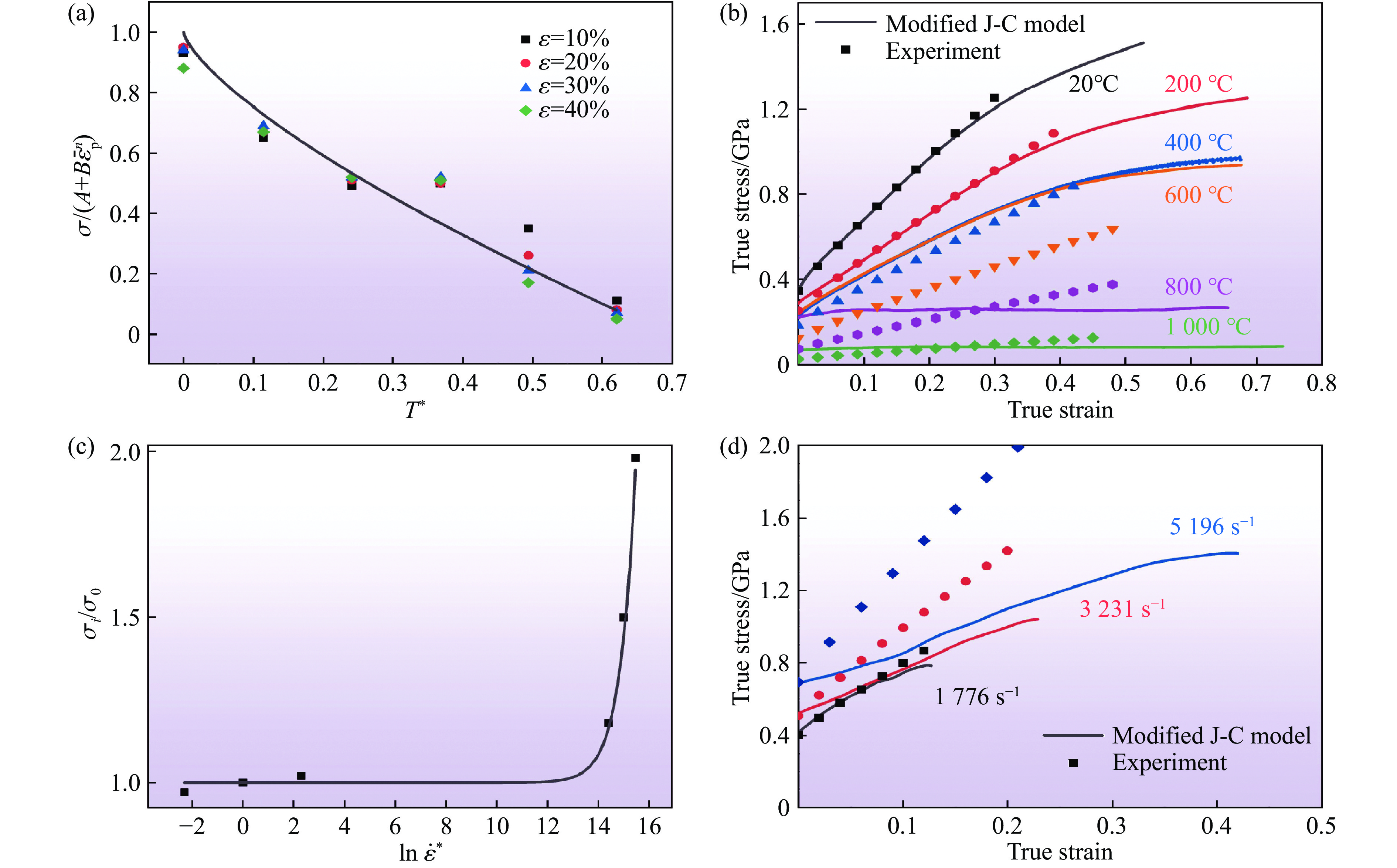 Figure 10.  Fitting results after the first revision: (a) $ \sigma /(A+B{\overline{\varepsilon }}_{\mathrm{p}}^{n}) $ - T* curve of the specimen under quasi-static compression at high temperature; (b) true stress-strain curves of specimens under quasi-static compression at high temperature; (c) $ {\sigma }_{i}/{\sigma }_{0} $-$ \mathrm{ln}\,{\dot{\varepsilon }}^{*} $ fitting curves; (d) true stress-strain curves of specimens under dynamic compression at room temperature