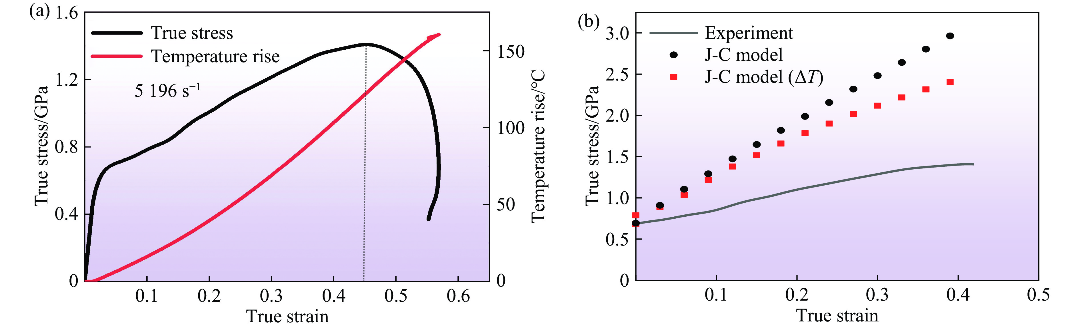 Figure 11.  (a) Changes of true stress and temperature rise with true strain at a strain rate of 5196 s−1; (b) comparison of true stress-strain between the experimental data and the J-C model results with and without considering the temperature