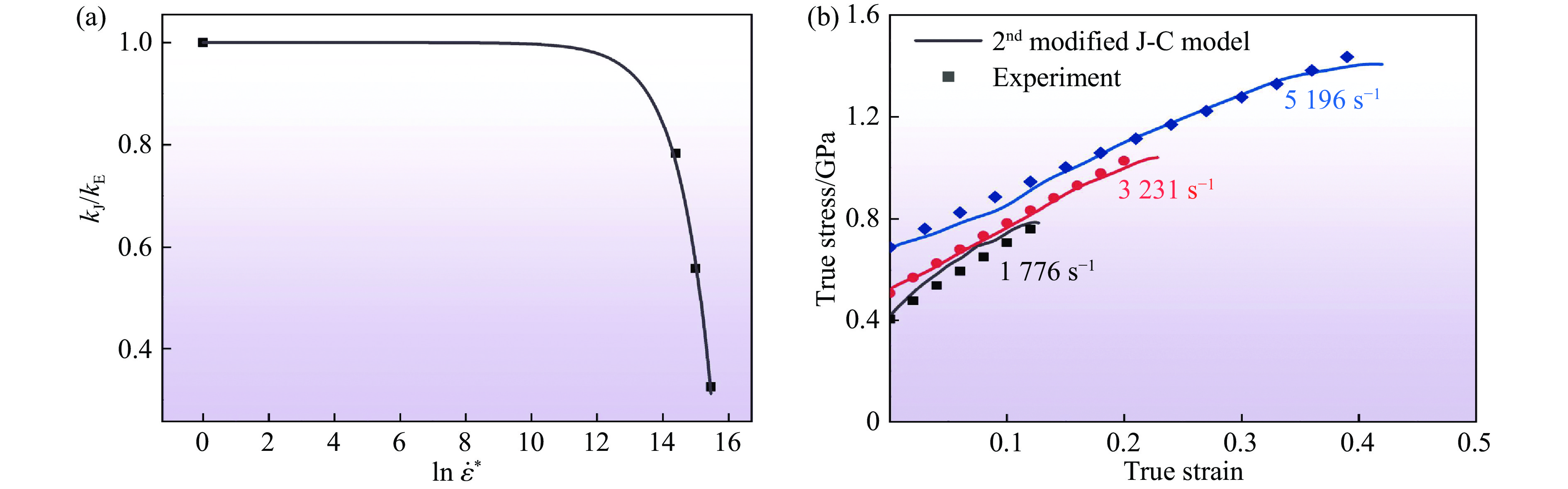 图 12  (a) 不同应变率和参考应变率下真实应力-真实应变曲线屈服段斜率之比$ {k}_{\mathrm{J}}/{k}_{\mathrm{E}} $,(b) 第2次修正J-C模型得到的室温动态加载下试样的真实应力-真实应变拟合曲线