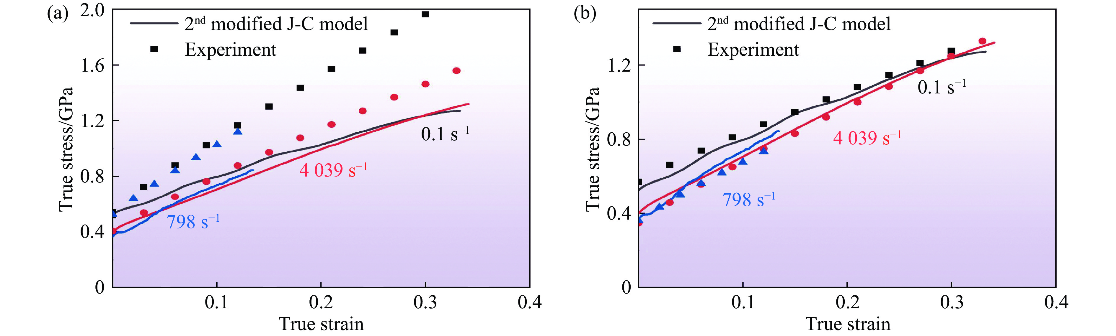 分别采用修正前和修正后的J-C本构方程进行拟合,得到其他应变率下的真实应力-应变曲线,如图13(a)和图13(b)所示。对比发现,修正后的J-C本构方程的拟合效果良好。