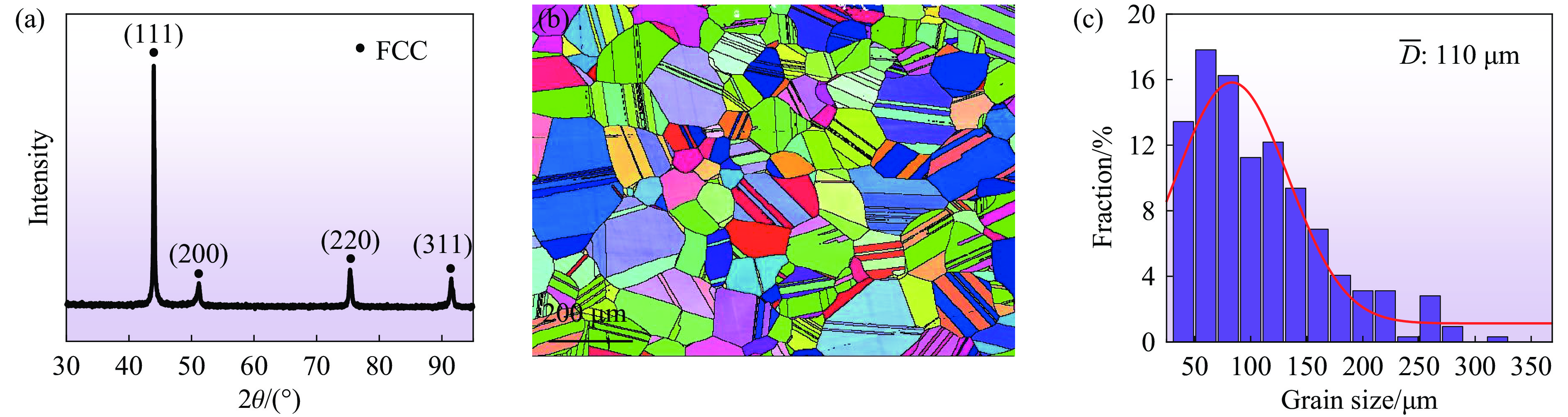 Figure 2.  XRD pattern (a), the inverse pole figure of microstructure (b), and grain size distribution (c) of CrCoNiSi0.3 MEA