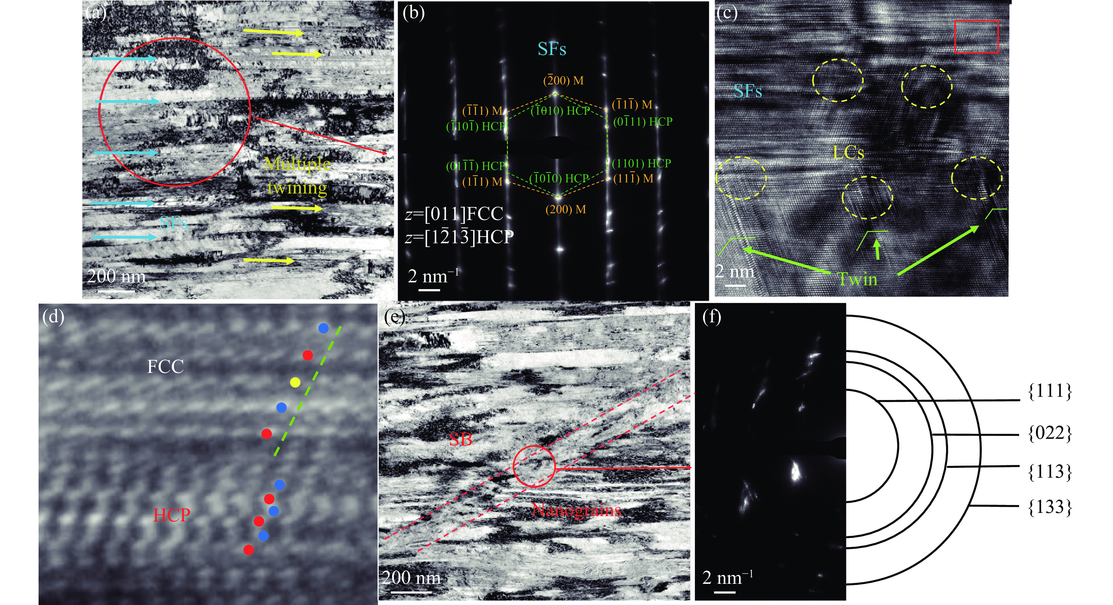 • 首先,对准静态压缩变形机理进行研究。图5为室温准静态压缩(10−3 s−1)下应变达到45.8%时试样的TEM图像。从图5(a)可以观察到大量的层错(stacking faults,SFs)、孪晶(twin),以及交叉孪晶(multiplc twining)。图5(b)所示的衍射图样和图5(c)所示的高分辨图像进一步证明了其存在。图5(d)为图5(c)矩形区域的放大图。从图5(b)和图5(d)可以观察到密排六方(hexagonal close packed,HCP)组织,表明试样发生了FCC到HCP的相变。此外,从图5(d)还可以看到交叉层错形成的Lomer-Cottrells(LCs)位错锁。这些机制的综合作用促使合金形成较强的加工硬化能力。从图5(e)观察到严重变形的组织,形成剪切带(shear band,SB)。图5(f)中未完全成形的纳米环表明,剪切带内部为纳米晶雏形。
