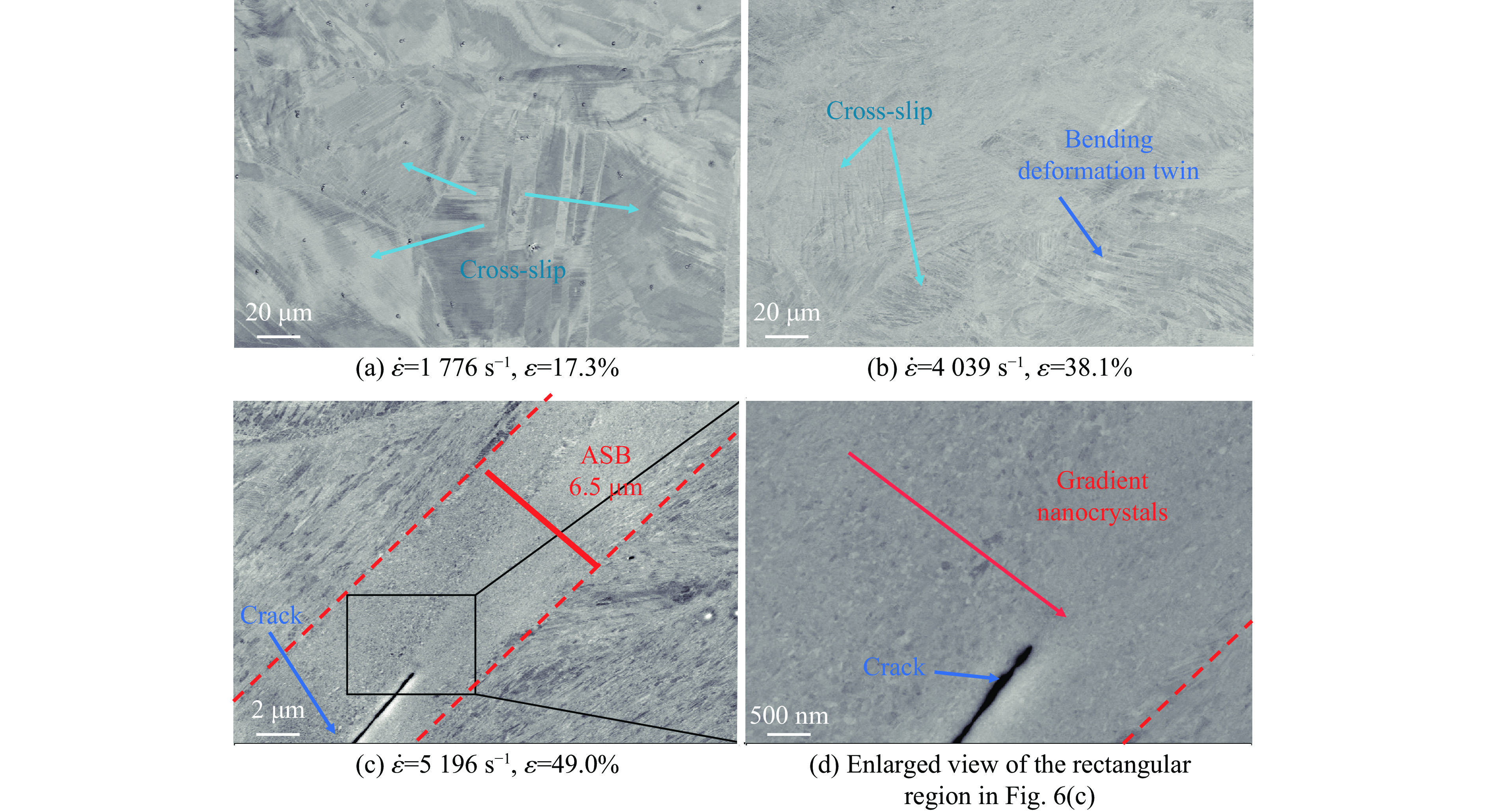 为了研究不同应变率下的压缩变形机理,对动态加载下(177640395196 s−1)变形后的试样进行SEM表征,分析其微结构变形机制和剪切带的形成。图6(a)和图6(b)分别给出了应变率为1776 s−1、应变为17.3%以及应变率为4039 s−1、应变为38.1%的2个试样的SEM-BSD图像。观察图6(a)发现,1776 s−1应变率下CrCoNiSi0.3中熵合金的晶粒变形较小,晶粒内部存在交错的滑移(cross-slip)。从图6(b)观察到,4039 s−1应变率下材料晶粒变形明显,存在弯曲交叉的变形孪晶(bending deformation twin)。图6(c)为应变率为5196 s−1、应变为49.0%的试样的SEM-BSD图像,可以观察到清晰的宽度约为6.5 μm的绝热剪切带(adiabatic shear band,ASB),且在绝热剪切带中形成了微裂纹(crack)。绝热剪切带是指在高速变形、冲击载荷或其他高应变率加载条件下,材料局部区域因塑性变形功转化为热能且热量来不及散失,导致该区域温度急剧升高,进而发生剧烈的局部剪切变形,形成的一条窄带状变形区域[26]图6(d)为图6(c)中剪切带方框区域的放大图。绝热剪切带的内部发生明显的晶粒细化,两侧为严重变形的细长晶粒,绝热剪切带中心到两侧形成梯度纳米晶(gradient nanocrystals),裂纹处于梯度纳米晶的中间。微观上看,高应变率加载下,位错运动更加剧烈,位错密度不断变化,其增殖、运动和交互作用更加复杂。位错之间的相互交割、缠结等会使位错运动阻力不断变化,导致材料的应变硬化率发生波动。同时,即使没有形成明显的绝热剪切带,高速变形过程中产生的热量也会使材料温度升高,而温度变化会影响材料的力学性能,如使材料的屈服强度降低、应变硬化能力改变等。试件不同部位的温度升高情况可能不同,这是导致动态加载下应变硬化率曲线出现波动的另一原因[10, 27]