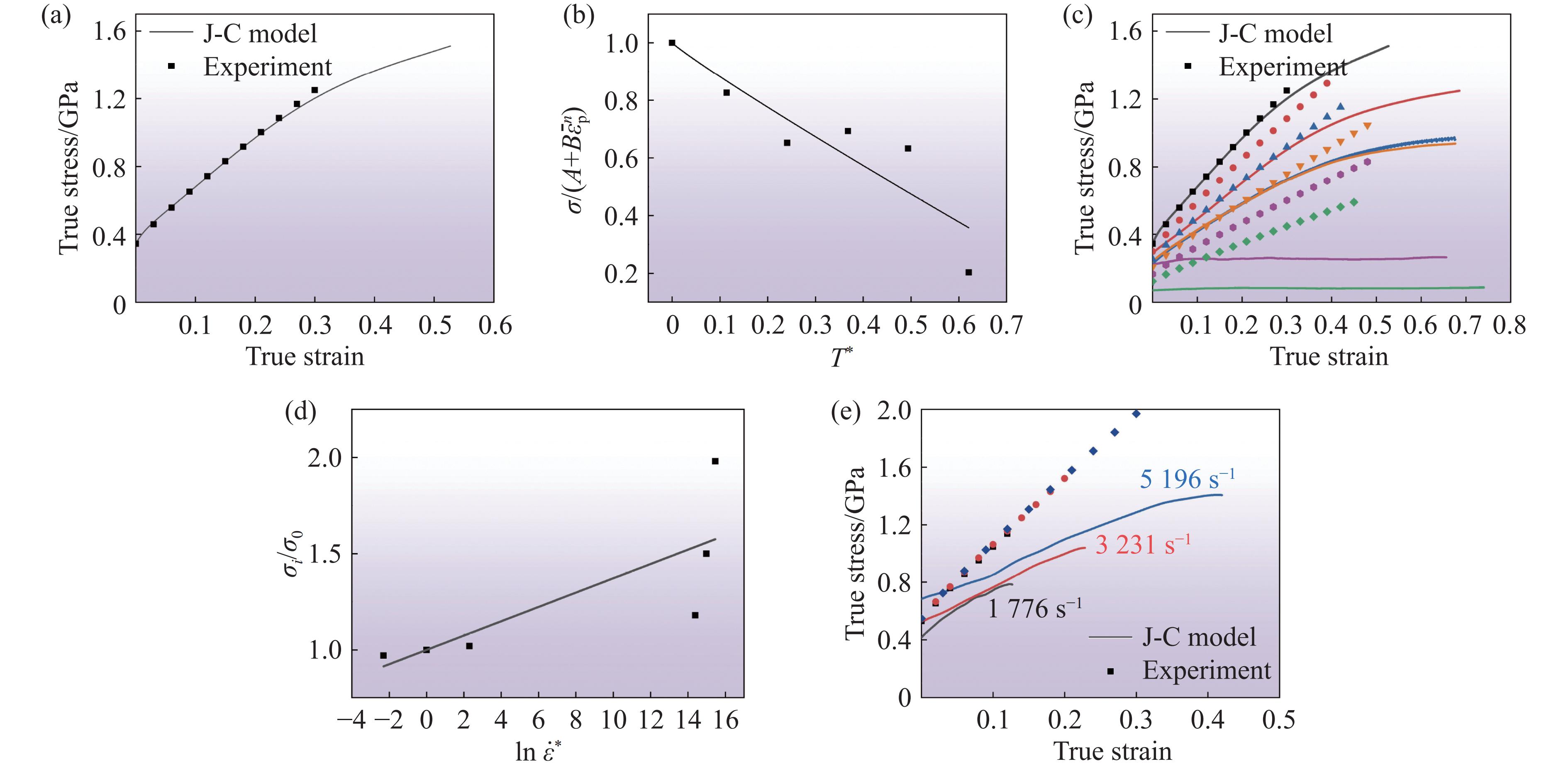 图 9  (a)室温准静态($ {T}_{\mathrm{r}}=20 $ ℃,$ \dot{\varepsilon }={10}^{-3} $s−1)压缩下试样的真实应力-真实应变曲线,(b) 高温准静态加载下$ \sigma /(A+B{\overline{\varepsilon }}_{\mathrm{p}}^{n}) $T*的拟合曲线,(c) 高温准静态加载下真实应力-真实应变曲线,(d) $ {\sigma }_{i}/{\sigma }_{0} $-$ \mathrm{ln}\,{\dot{\varepsilon }}^{*} $拟合曲线,(e) 室温动态加载下试样的真实应力-真实应变曲线