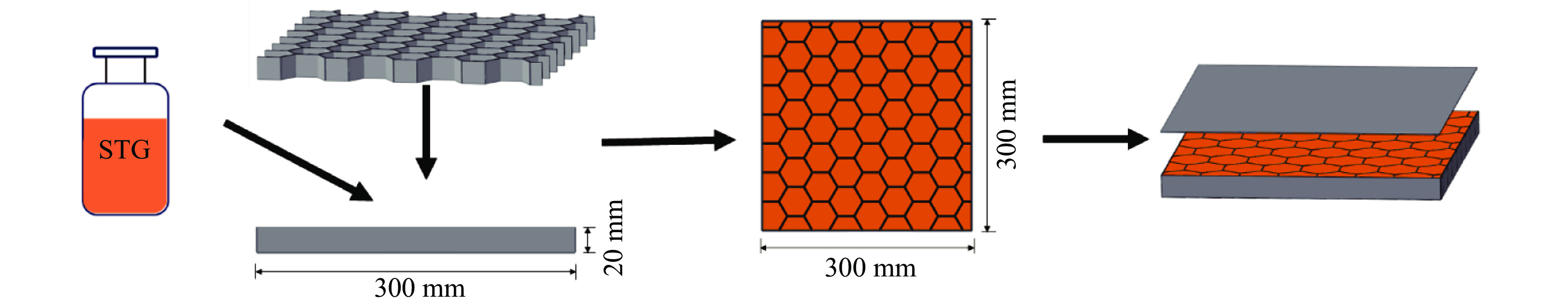 • STG填充蜂窝夹芯板由上面板、底部方形容器、蜂窝板以及STG组成。其中:面板和底部容器材料为201不锈钢,厚度为1 mm,高度为20 mm;蜂窝板材料为Al6061-T6铝合金,壁厚0.2 mm,高度19 mm,材料参数见表1[2021],其中:ρ为密度,E为杨氏模量,μ为泊松比,σY为屈服应力,Et为切线模量。夹芯板的尺寸为300 mm×300 mm,总高度为21 mm。具体装配流程如图1所示,首先将STG放置在底部容器(300 mm×300 mm×20 mm)中自然流匀,随后将蜂窝板置于STG表面,使其自然沉降,待STG与蜂窝完全融合后,将上面板与底部容器组合。为避免STG在运输和实验过程中随意流动对实验结果造成影响,采用冷焊技术将上面板与底部框架封闭固定。