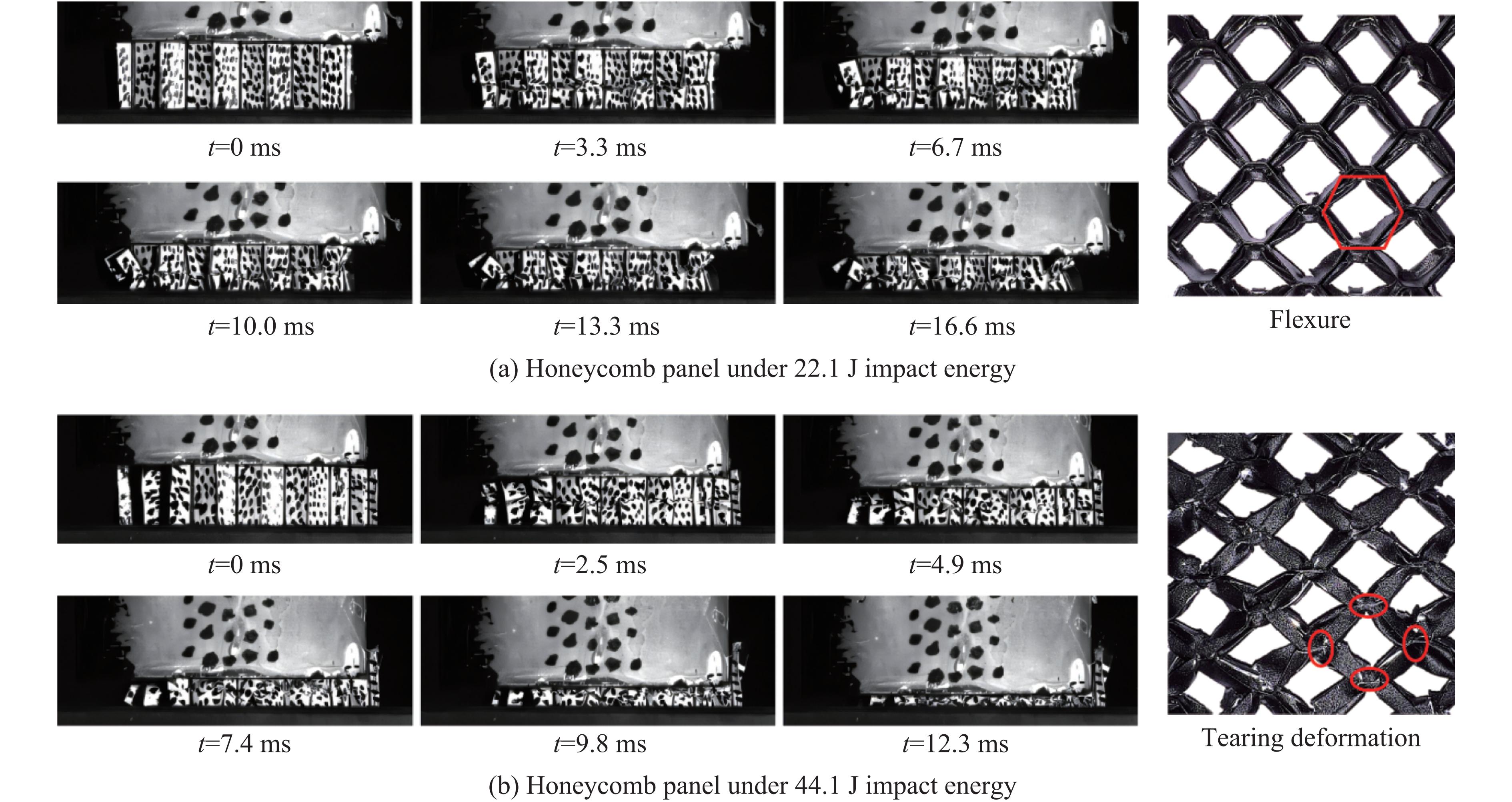 Figure 10.  Deformation characteristics of honeycomb panels under different impact energies