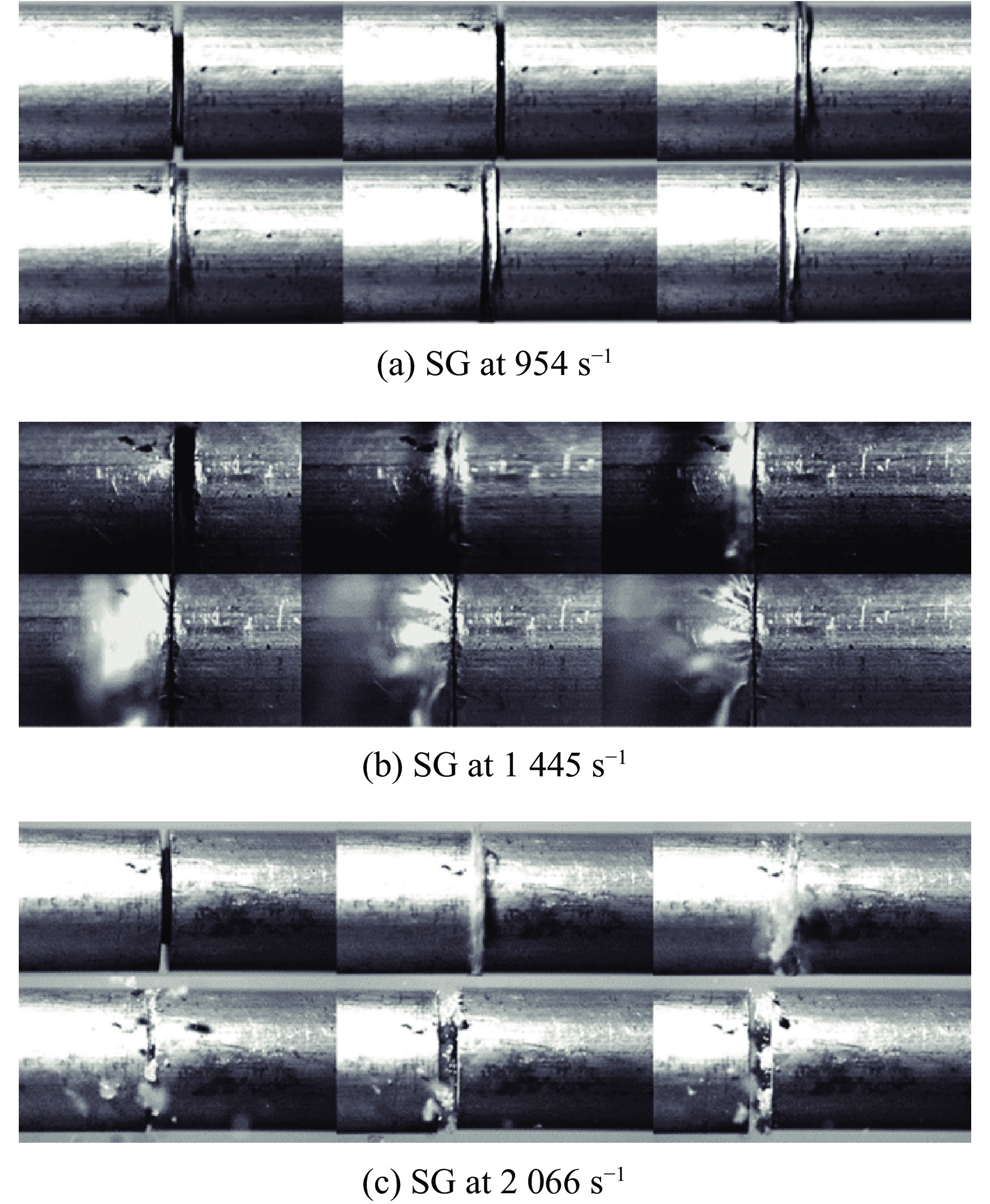 图11展示了STG在不同应变率的SHPB冲击下的变形特征,具体表现为以下3种情况:在较低应变率(887~1200 s−1)下,STG在冲击过程中发生振荡变形,但整体仍保持粘连状态,主要归因于STG在较低应变率下具有较强的黏性,使得胶体维持完整性;当应变率增加至1223 s−1时,胶体迅速扩散并形成较大的变形区域,但仍未发生断裂;在中应变率(12231580 s−1)下,STG同时受到黏性与弹性响应的共同作用,胶体仍保持一定程度的粘连状态;当应变率提高至1660 s−1及以上时,STG的变形行为呈现出类似玻璃脆性断裂的特征,胶体不再保持完整,而是迅速破裂并分散成多个碎片向四周飞射。这种变形行为表明,在较高的应变率下,STG的黏性响应显著减弱,材料主要依靠弹性变形来抵抗冲击载荷。由于缺乏足够的黏性耗散机制,STG在较高应变率(16602310 s−1)下表现出较低的韧性和较高的脆性。