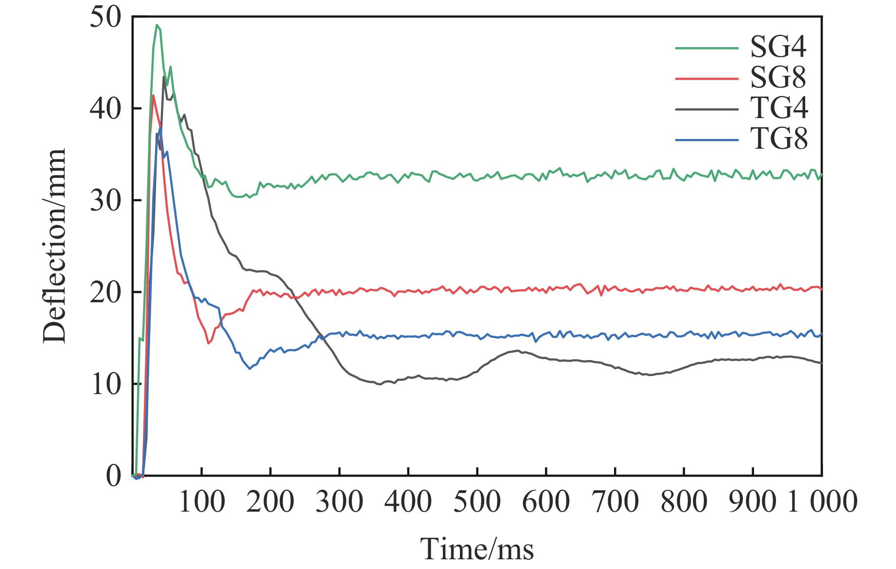 在相同剪切增稠效应情况下,与TG8(残余挠度为17.2 mm)相比,TG4的残余挠度降至13.7 mm,降幅达20.3%,说明更密集的蜂窝结构能够提升整体刚度,使爆炸冲击载荷更均匀地分散并传递,从而改善背面板的防护效果;此外,在相同蜂窝边长条件下,与SG8(残余挠度为20.9 mm)相比,TG8的残余挠度降低17.7%,高应变速率下,TG体系的剪切增稠效应使STG迅速变硬,相当于在瞬态冲击过程中为蜂窝芯层提供更强的支撑,使其更有效地缓冲爆炸冲击载荷,说明更显著的剪切增稠效应能够有效增强蜂窝芯层的抗冲击能力,从而降低背面板的变形。综合来看,TG4的背面板变形最小,说明小尺寸蜂窝与高剪切增稠效应的协同作用能够更有效地缓冲爆炸冲击,从而减小背面板的变形程度。