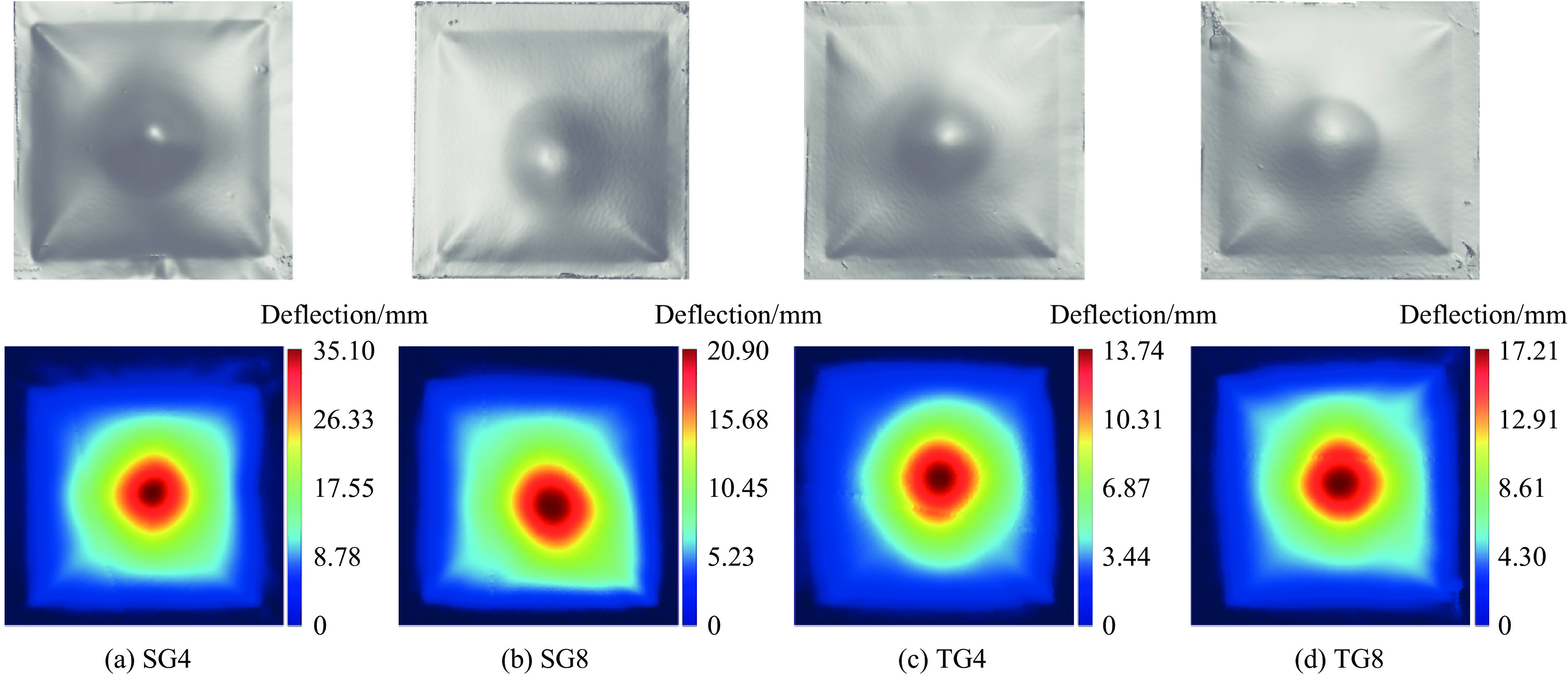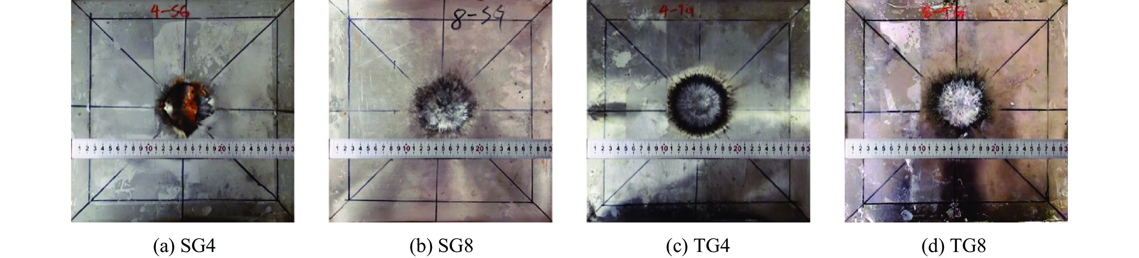 • 前面板的变形数据和变形形态见表5图8。4种试样的前面板均产生直径为70 mm左右的变形区域:SG4前面板发生直径为75 mm的冲孔型破坏;SG8的凹陷较小,直径为72 mm,深度为9.0 mm;TG4前面板出现直径78 mm、深12.0 mm的凹陷;TG8的凹陷最小,直径为69 mm,深度为8.5 mm。
