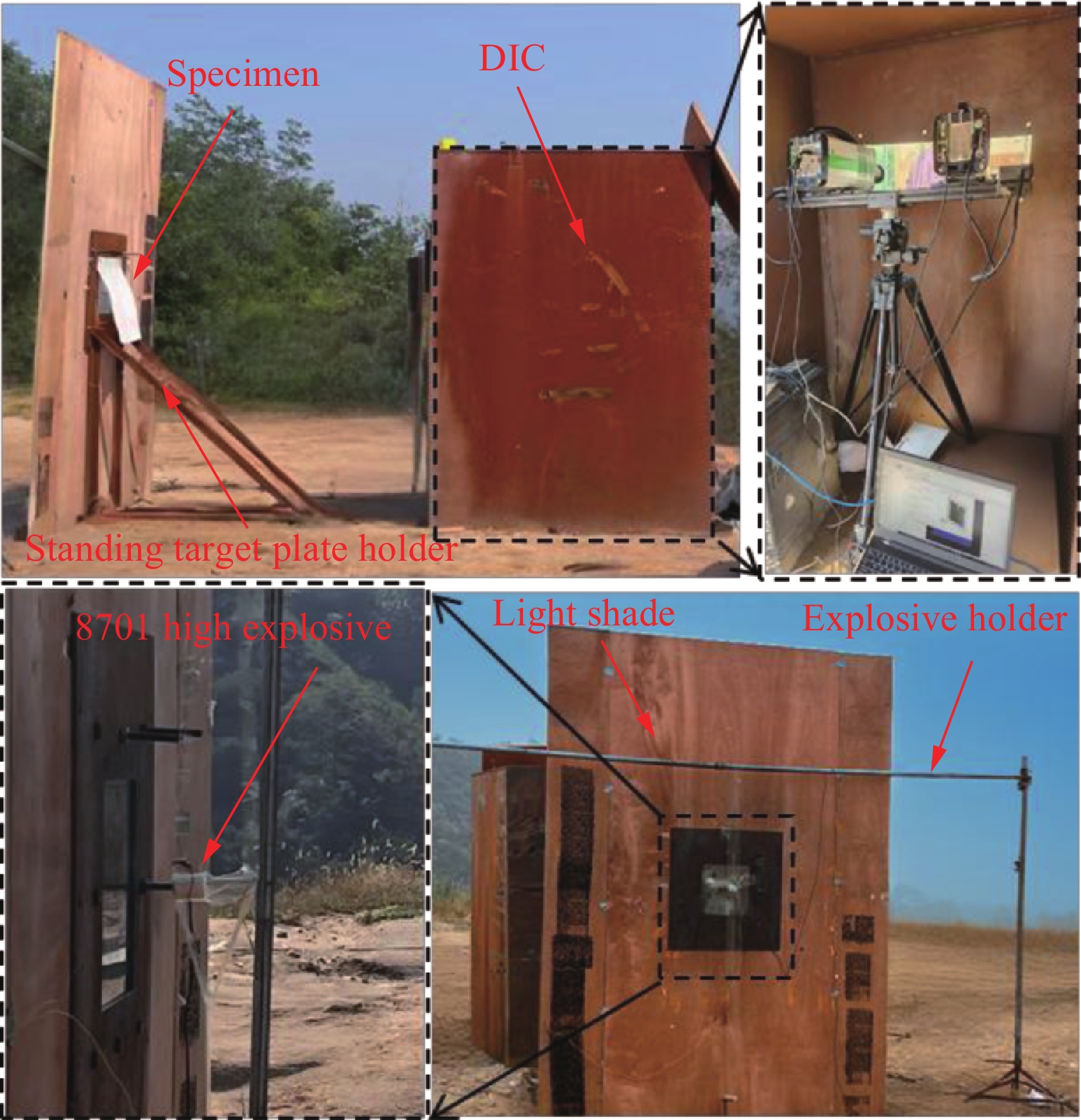 • 爆炸实验装置布局如图2所示。爆炸源为8701高性能柱形炸药(主要成分为黑索金),质量为35 g,直径为28 mm,高度为33 mm,材料参数如表3[22]所示,其中:DpCJ分别为炸药爆速和CJ爆轰压力,A1B1R1R2ω均为材料常数,Ea为比内能。将炸药悬挂于距离地面110 cm高度处,采用雷管单点起爆方式引爆,起爆点位于柱形炸药后端面中心。采用高度为150 cm的立姿靶板支架固定靶板,靶板中心点距地面的高度为110 cm,距离炸药前端80 mm,采用数字图像相关(digital image correlation,DIC)技术记录并测量靶板的变形。