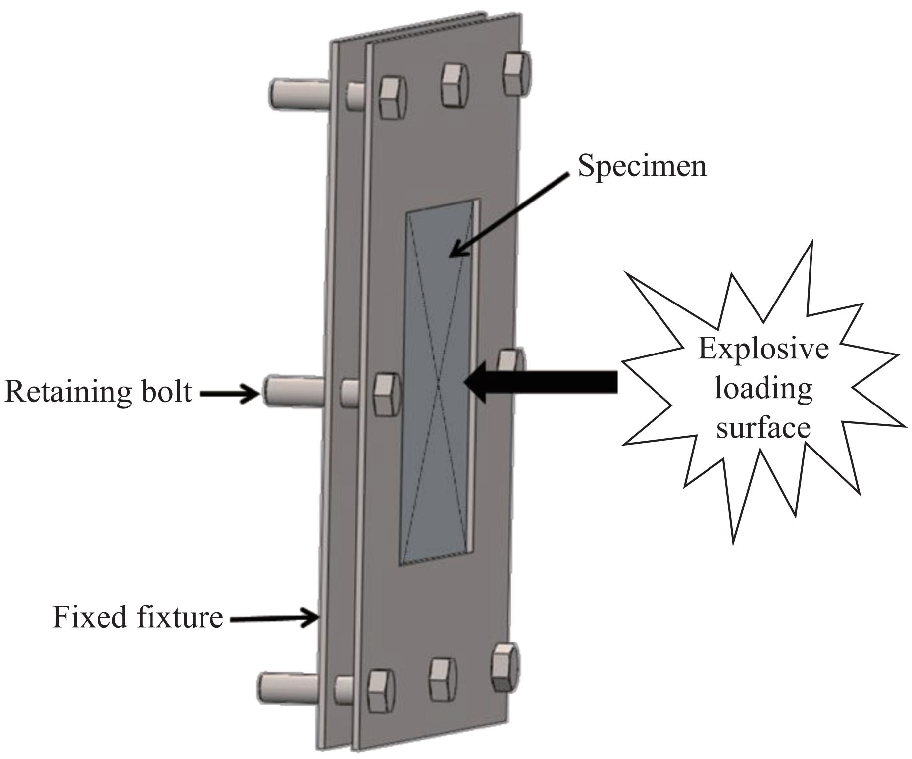 靶板细节如图3所示。用于固定试件的夹具由2块20 mm厚的钢板和8只螺栓组成,钢板中心开尺寸为250 mm×250 mm的方孔,作为试件的受载区域。