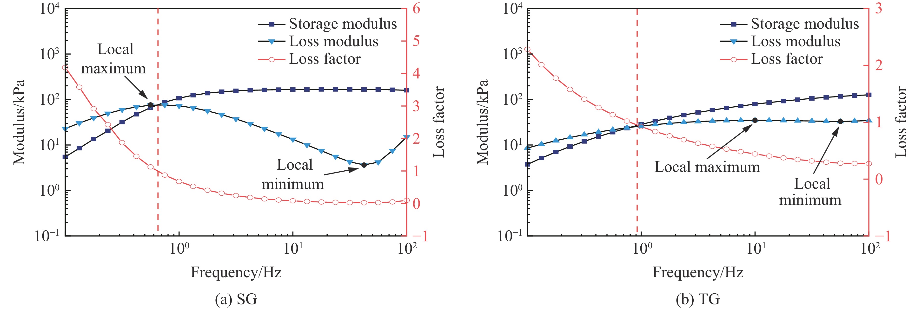 随着测试频率由0.1 Hz增加到100 Hz,SG的损耗因子从4.18下降到0.09,TG的损耗因子从2.28下降到0.27;SG和TG的损耗因子分别在0.65和0.93 Hz时等于1。损耗因子从大于1降低到接近或小于1的这个阶段进一步证实了STG从液态向固态的黏弹性转变趋势。